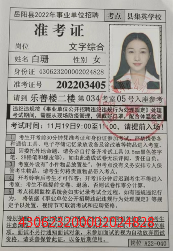 你好,我想申请复核岳阳县事业单位考试的成绩,我报考的岗位是A22,名字是白珊,考号为202203405 |