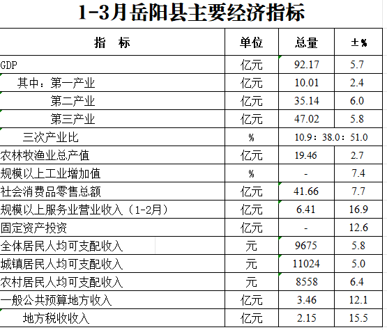2023年一季度岳阳县主要经济指标