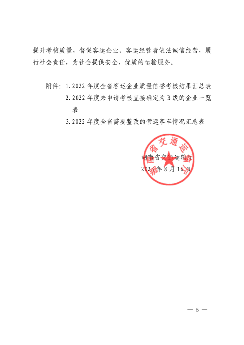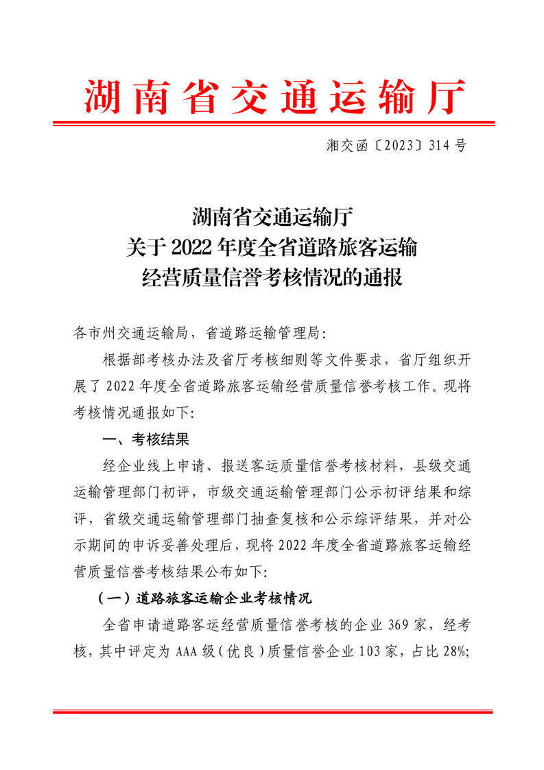 湖南省交通运输厅关于2022年度全省道路旅客运输经营质量信誉考核情况的通报