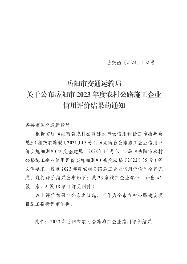 关于发布岳阳市2023年度农村公路施工企业信用评价结果的通知