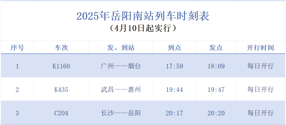 为更好满足城际间旅客出行需求4月10日起岳阳南站将增开一趟,长沙→岳阳 C204次城际列车,铁路部门提醒增开列车信息可通过铁路12306网站客户端或致电12306查询。
