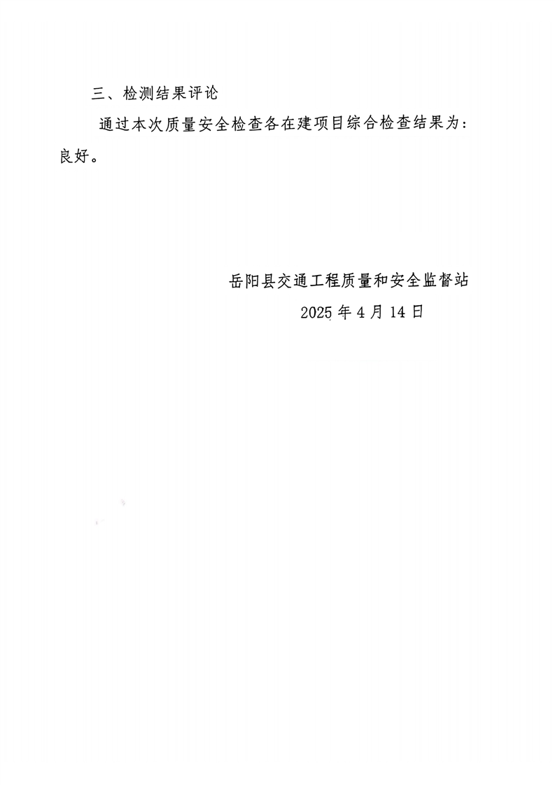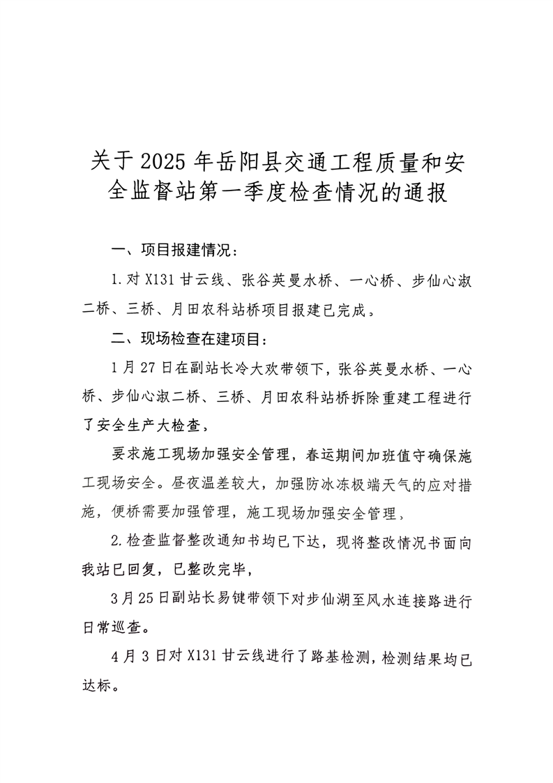 关于 2025年岳阳县交通工程质量和安全监督站第一季度检查情况的通报