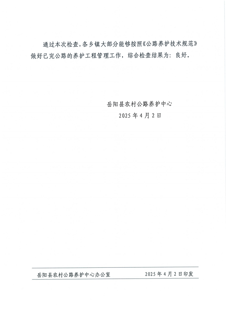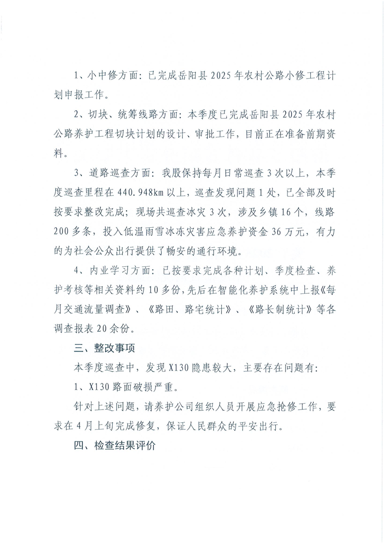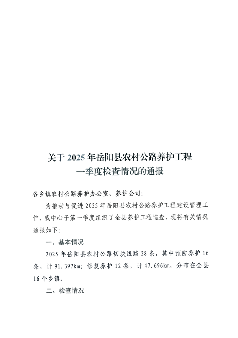 2025年岳阳县农村公路养护工程第一季度检查情况的通报