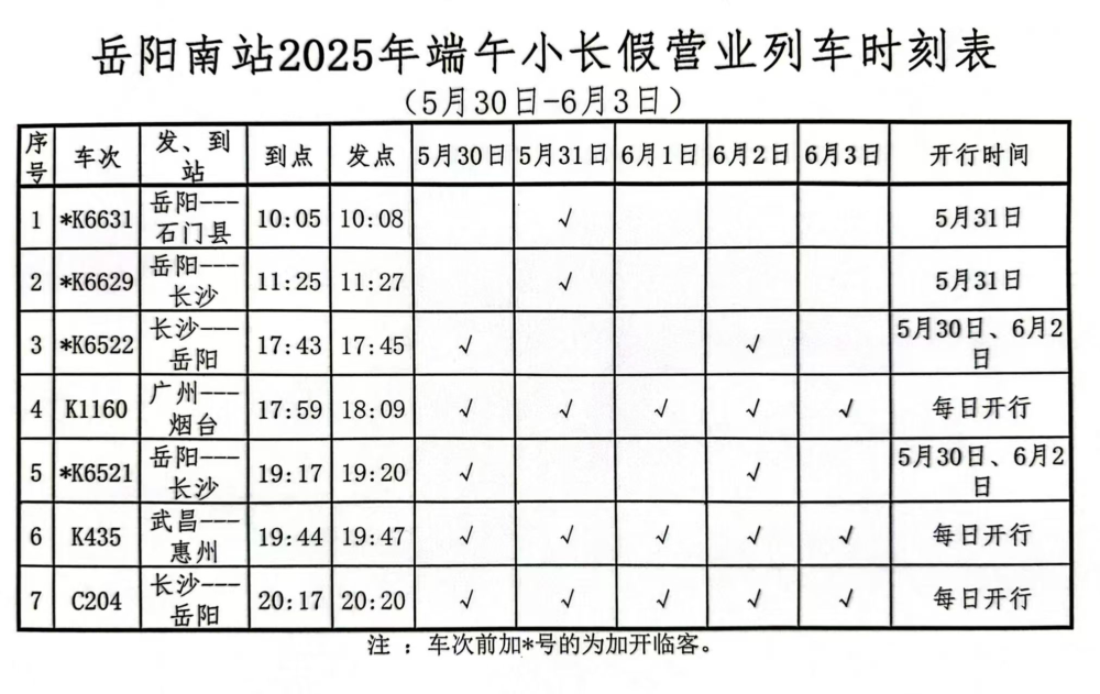岳阳南站2025年端午小长假营业列车时刻表(5月30日-6月3日)