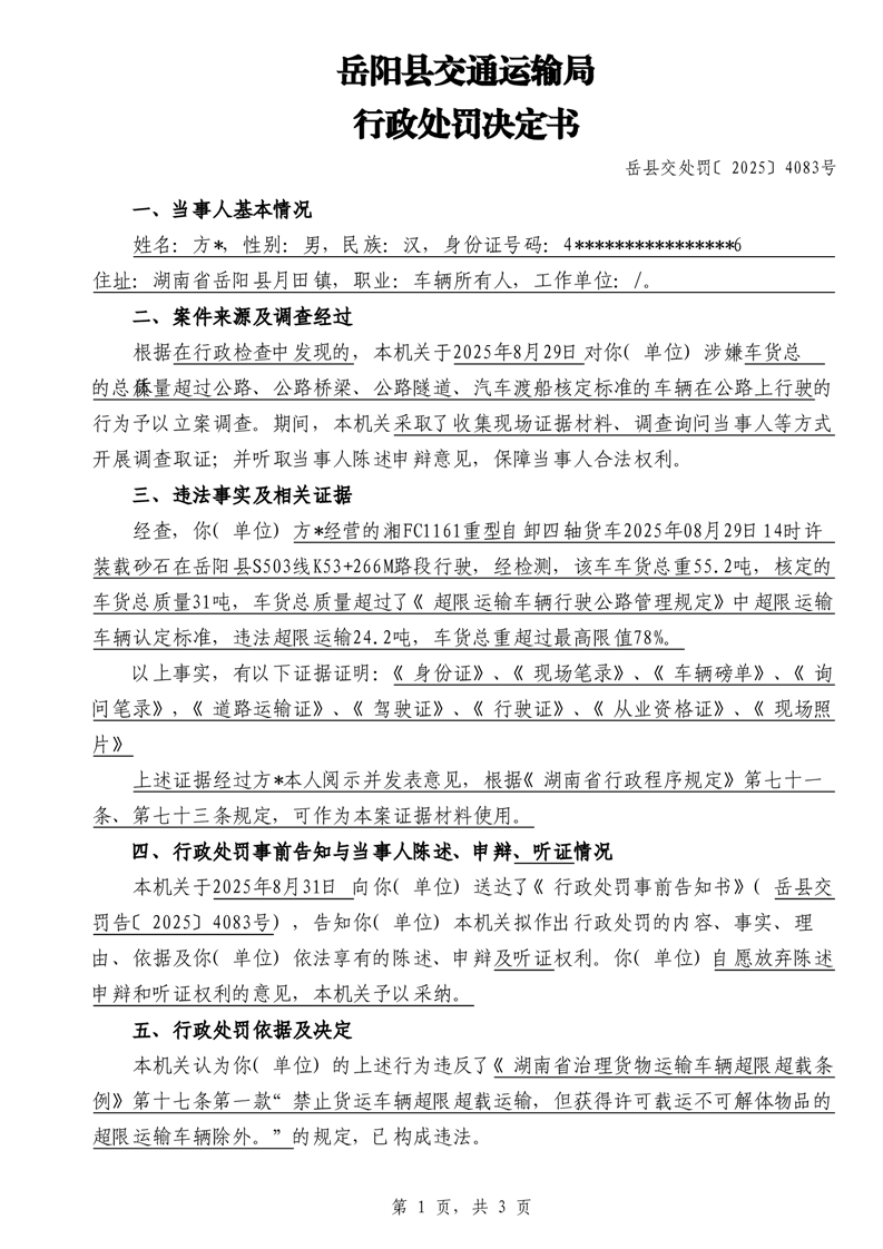 行政处罚决定书 岳县交处罚〔2025〕4083号