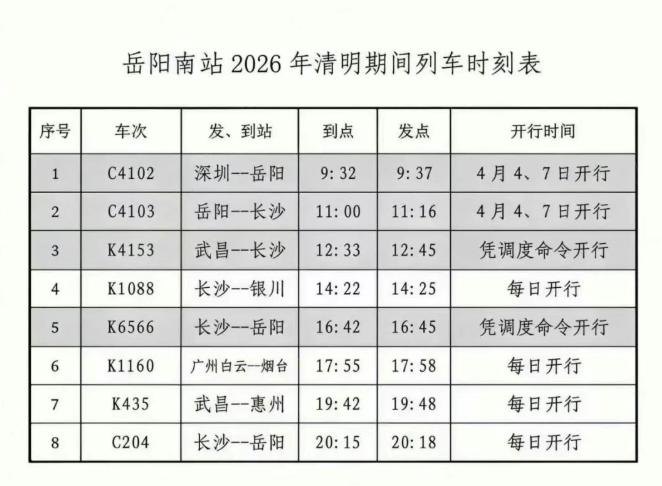岳阳南站2026年清明期间列车时刻表