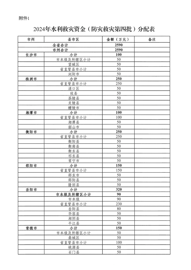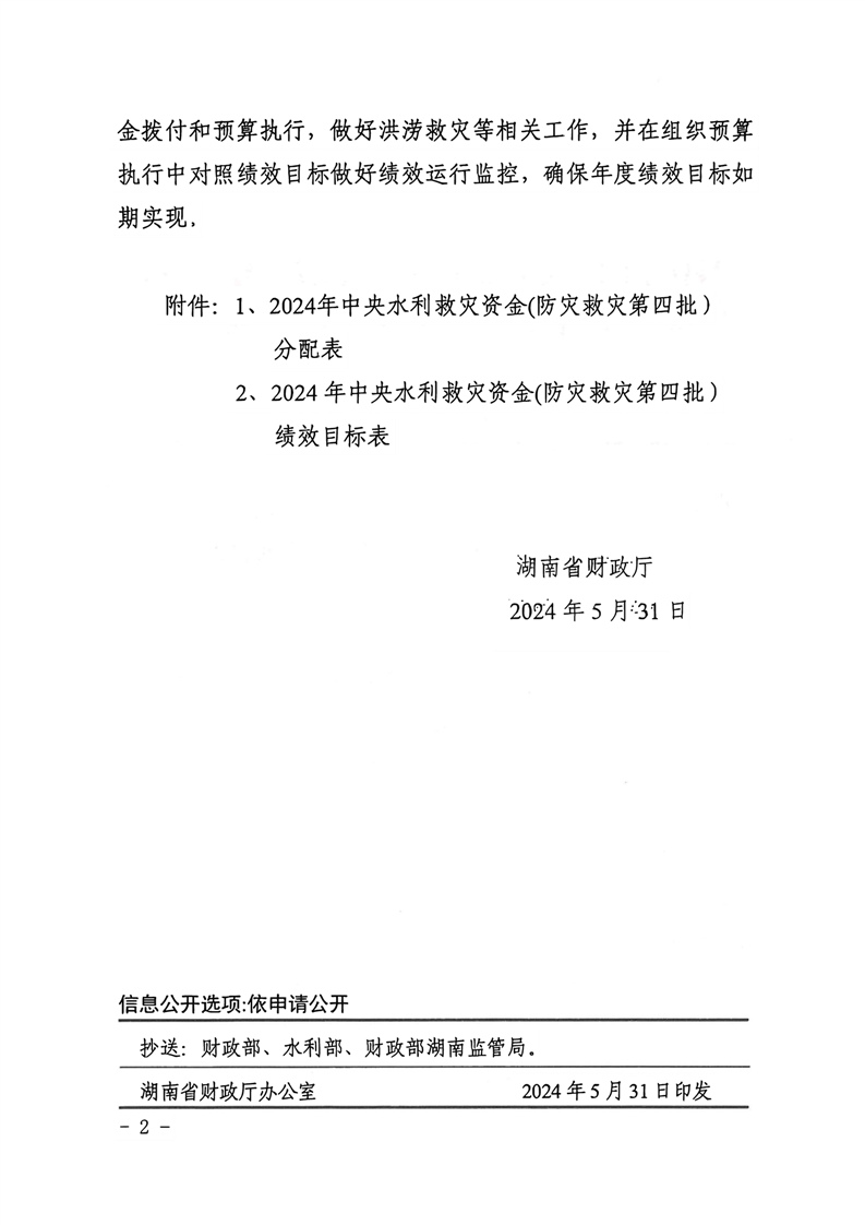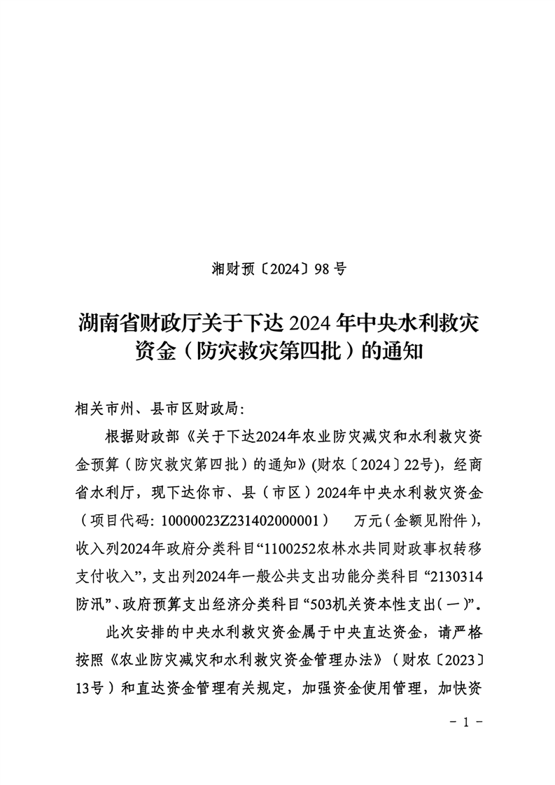 湖南省财政厅关于下达2024年中央水利救灾资金的通知