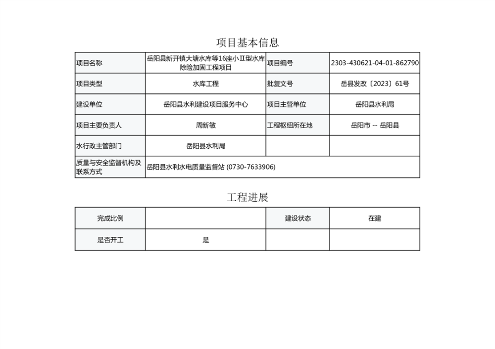 岳阳县新开镇大塘水库等16座小Ⅱ型水库除险加固工程项目信息公示