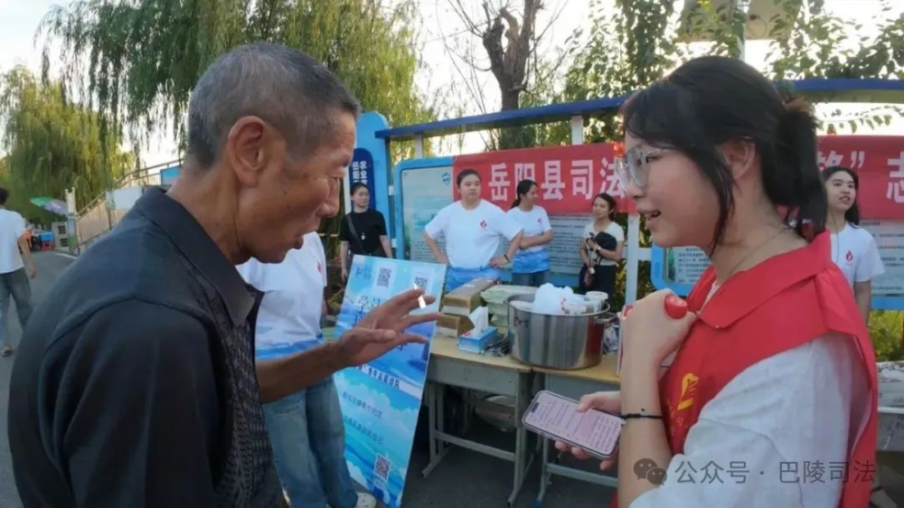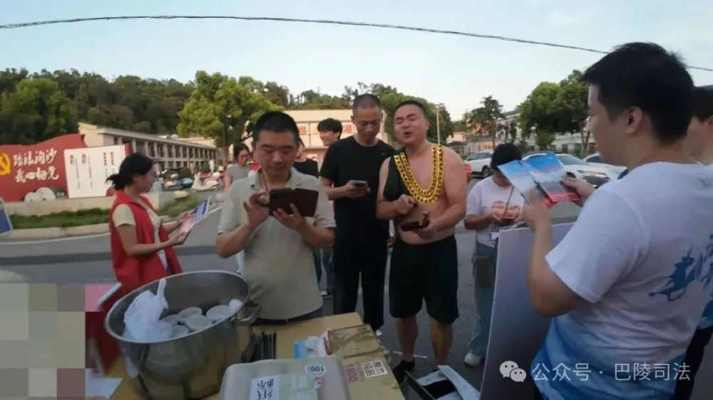 “关注‘巴陵司法’公众号,扫码参与答题就能领绿豆冰沙啦!80分以上还能参与抽奖!卷纸、纸杯、抽纸等你来领!”大学生志愿者们热情地招呼着,一边笑着引导群众参与。不少群众被绿豆冰沙的清凉吸引,纷纷掏出手机参与作答。有的边答题边念叨“这题选B!长江十年禁渔计划,我在新闻里看过!”有的凑在一起讨论“在东洞庭湖非法采砂应该向哪个部门举报”。看似严肃的法律知识,在冰沙的甜意和湖边的微风下变得生动起来。大家凑在一起讨论题目,有人为答错题懊恼,有人因拿高分欢呼,连小朋友都踮着脚抢着参与,现场俨然成了一场欢乐的“法治知识竞赛”。