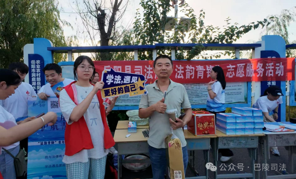 当洞庭晚风遇上“法治凉风”,一场有温度、有甜度的普法之旅在东洞庭湖展开,8月18日傍晚,岳阳县司法局组织大学生普法志愿者与“法韵青锋”志愿者团队前往东洞庭湖飘尾开展“守护一江碧水·送法下乡”活动。志愿者们带着绿豆冰沙与法律知识,为上千名群众送上清凉又“对味”的普法服务。