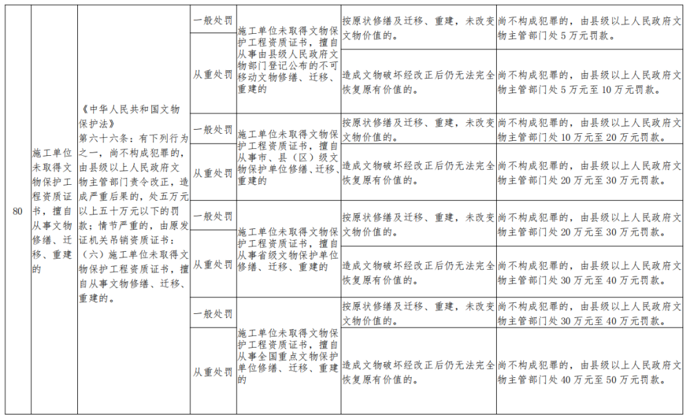 | 一级事项 | 行政处罚 | 二级事项 | 对未取得相应等级的文物保护工程资质证书,擅自承担文物保护单位的修缮、迁移、重建工程逾期不改正,或者造成严重后果的行为进行处罚 |