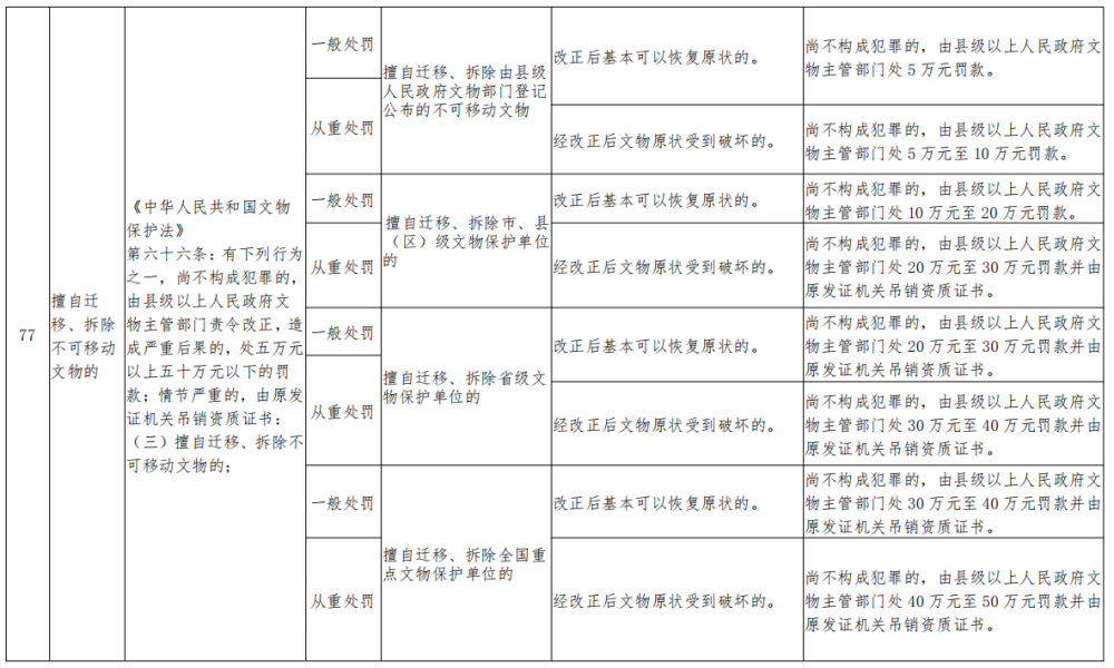 | 一级事项 | 行政处罚 | 二级事项 | 对擅自迁移、拆除不可移动文物的行为进行处罚 |