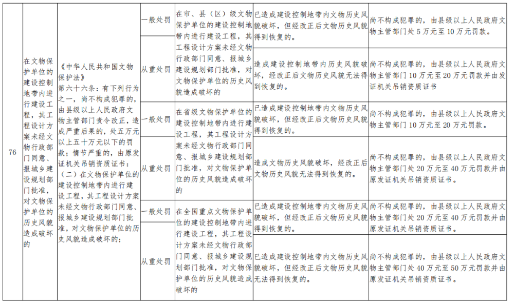 | 一级事项 | 行政处罚 | 二级事项 | 对在文物保护单位的建设控制地带内进行建设工程,其工程设计方案未经文物行政部门同意、报城乡建设规划部门批准,对文物保护单位的历史风貌造成破坏的行为进行处罚 |