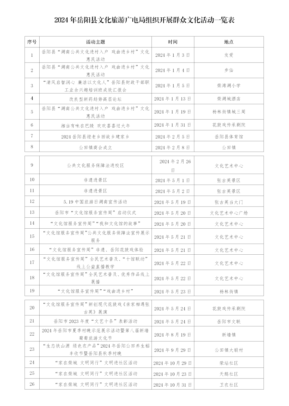 2024年岳阳县文化旅游广电局组织开展群众文化活动一览表
