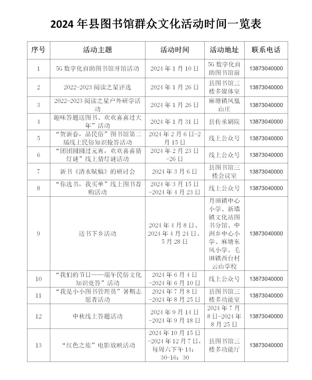 2024年县图书馆群众文化活动时间一览表
