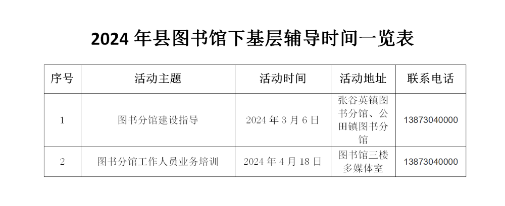 2024年县图书馆下基层辅导时间一览表