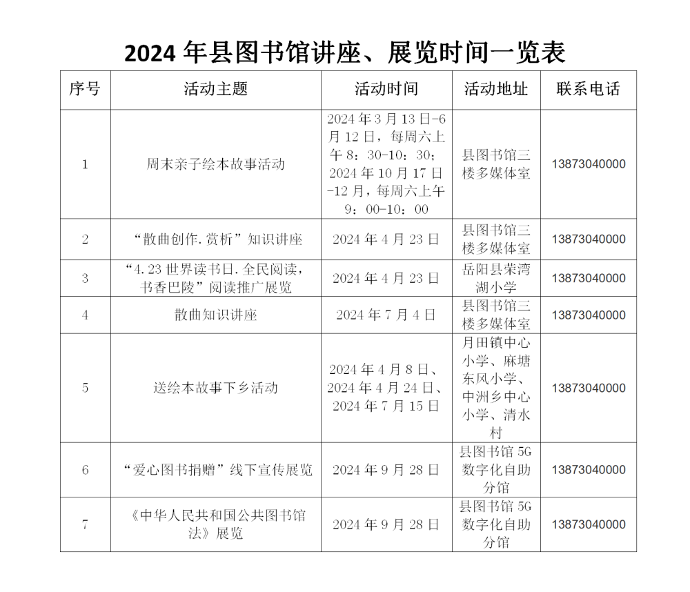 2024年县图书馆讲座、展览时间一览表