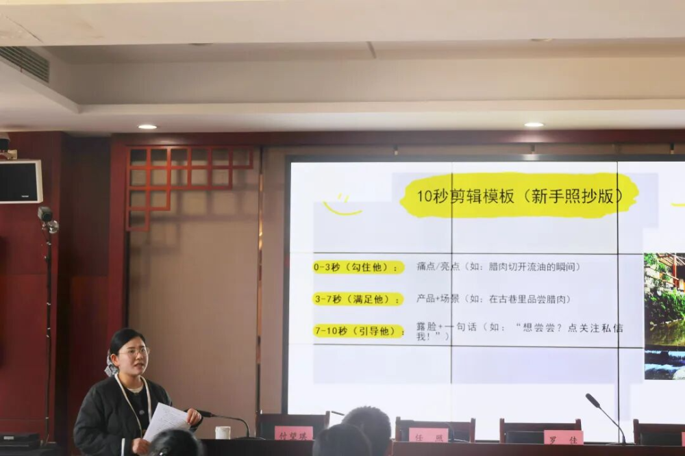 本次培训聚焦“自媒体实操”与“直播带货”两大主题,抖音20万粉丝博主赵妮首堂开讲,她用一个个真实案例教大家如何借助古村特色,让自家的生意在自媒体平台“出圈”。