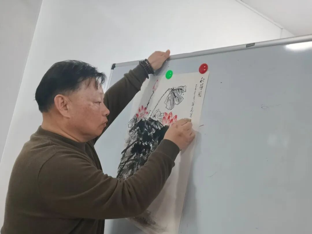 课堂上,丁老师以 “翠鸟的画法” 与 “荷花的画法” 为主线,由浅入深,为孩子们开启了一扇通往国画世界的大门。他从最基本的握笔姿势、水墨调和讲起,逐步演示如何勾勒翠鸟灵动的身姿,如何渲染荷花清雅的韵味。丁老师语言生动,示范清晰,将复杂的技法化为孩子们易懂的步骤。 现场挥毫,见证“秋荷”绽放 讲座最令人期待的环节,莫过于丁老师的现场创作演示。铺开宣纸,蘸墨提笔,丁老师气定神闲,挥洒自如。只见笔锋流转间,墨色浓淡相宜——舒展的荷叶、挺立的荷杆、欲放的花苞,一只俏皮的翠鸟悄然立于荷梗之上,生机盎然。片刻功夫,一幅气韵生动的 《秋荷图》 便跃然纸上,栩栩如生。 ![]()