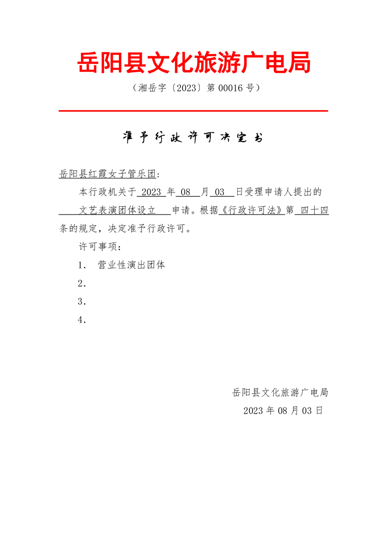 岳阳县红霞女子管乐团行政许可决定书