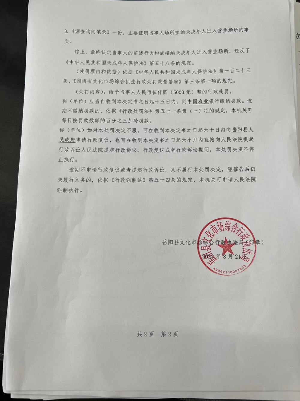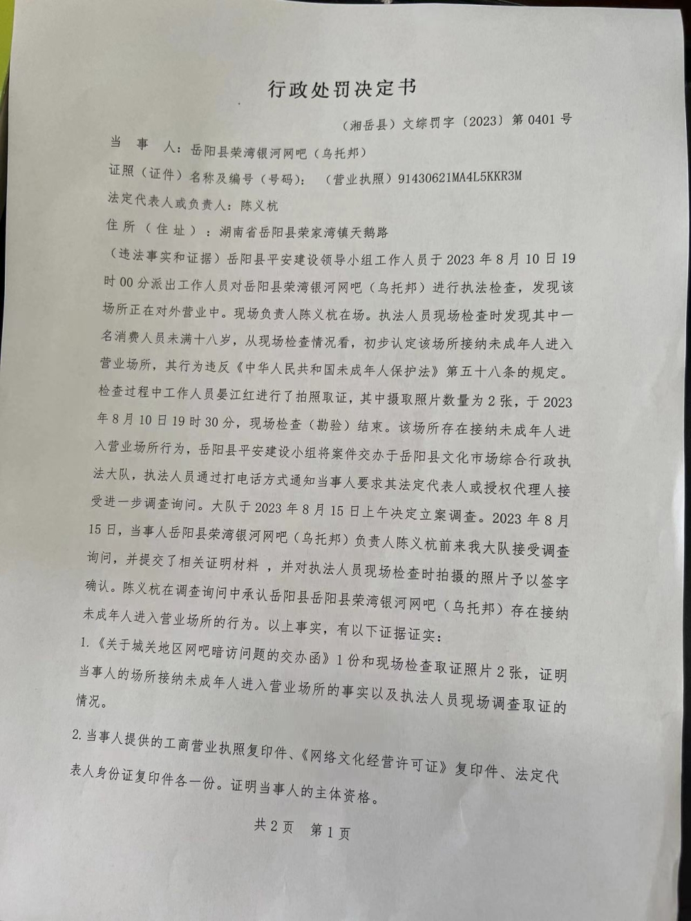 岳阳县银河网吧(乌托邦)接纳未成年人进入营业场所