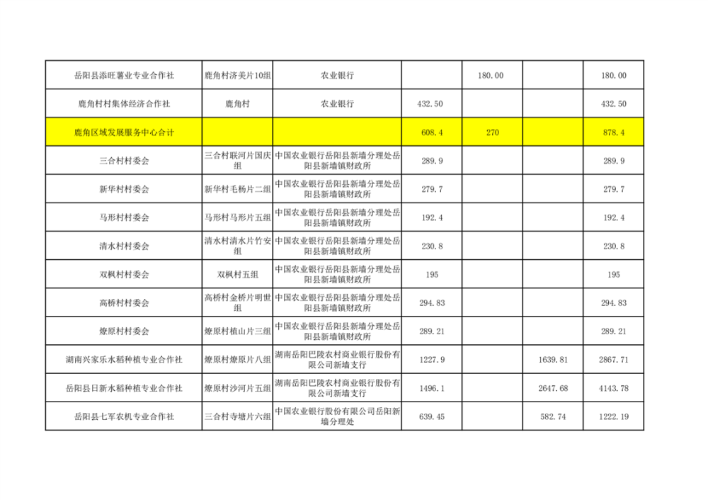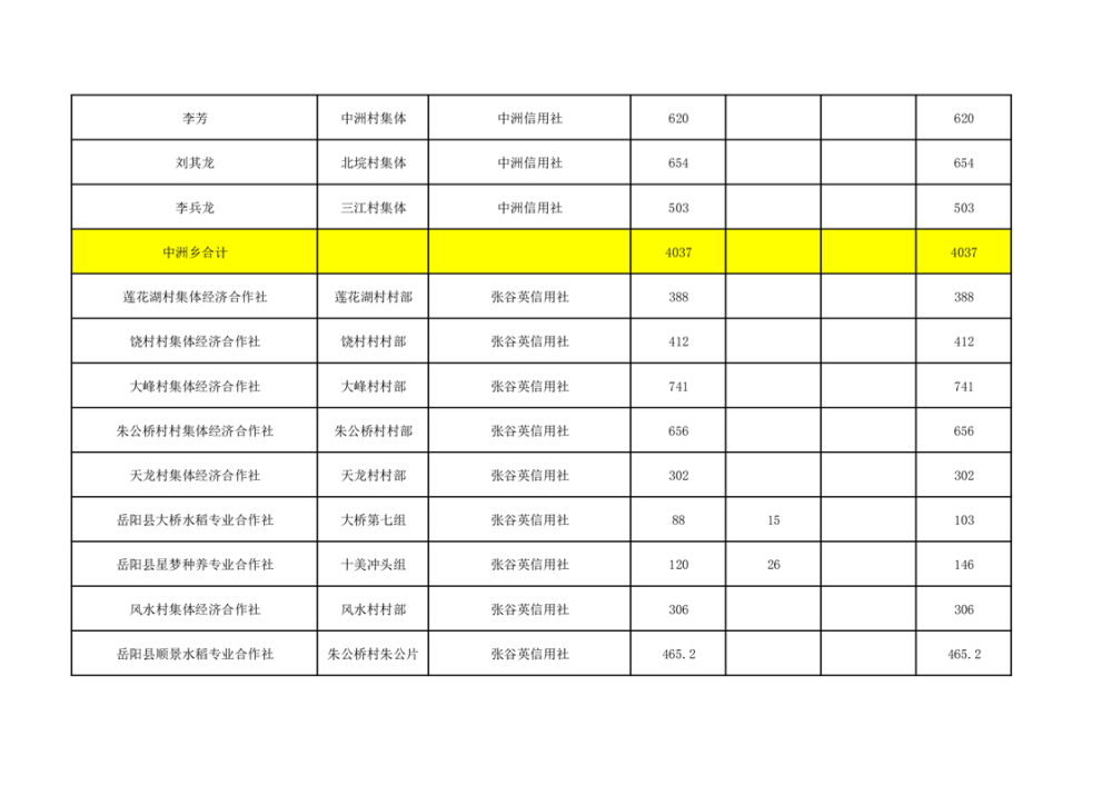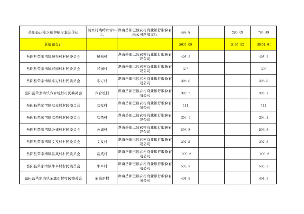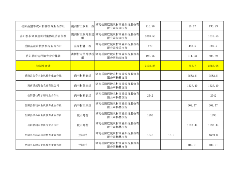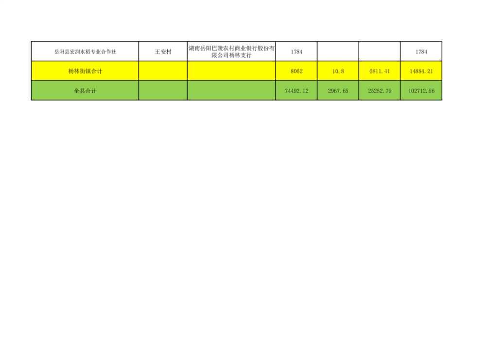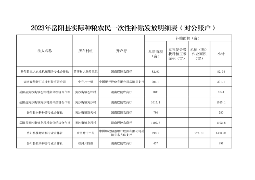 2023年岳阳县实际种粮农民一次性补贴发放明细表(对公账户)