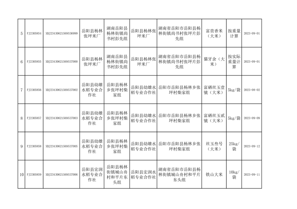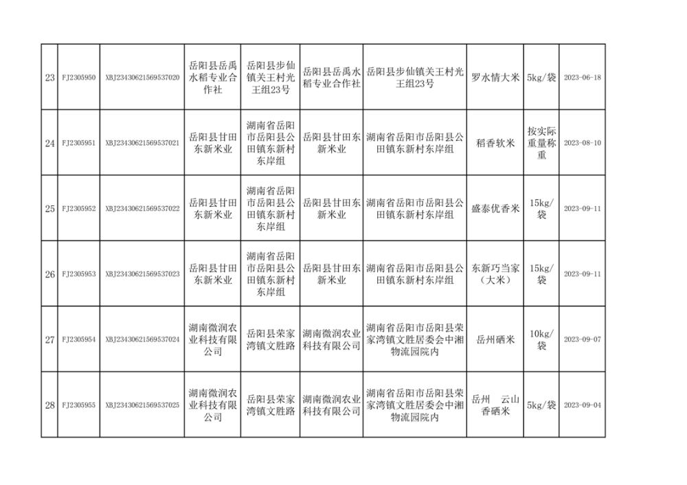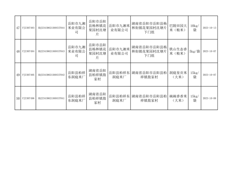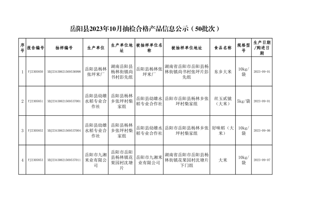 2023年10月岳阳县抽检合格产品信息公示(50批次)