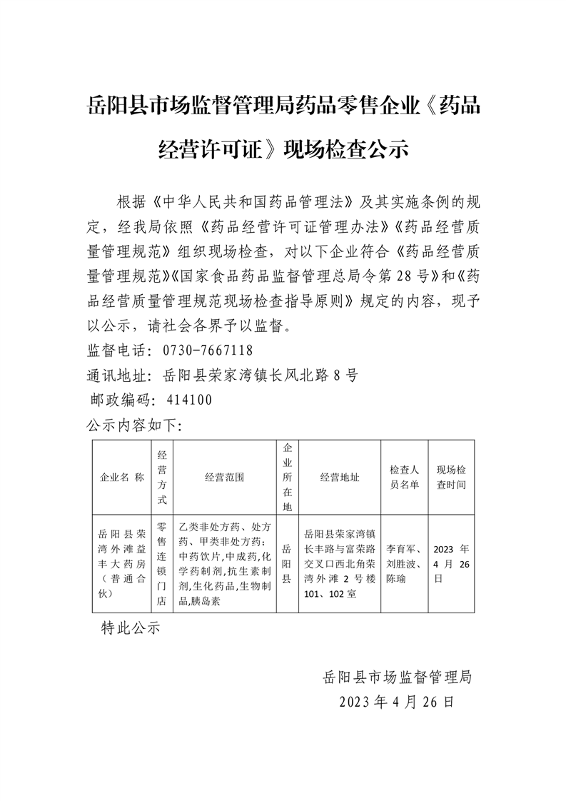 岳阳县市场监督管理局药品零售企业《药品经营许可证》现场检查公示(2023年4月26日)