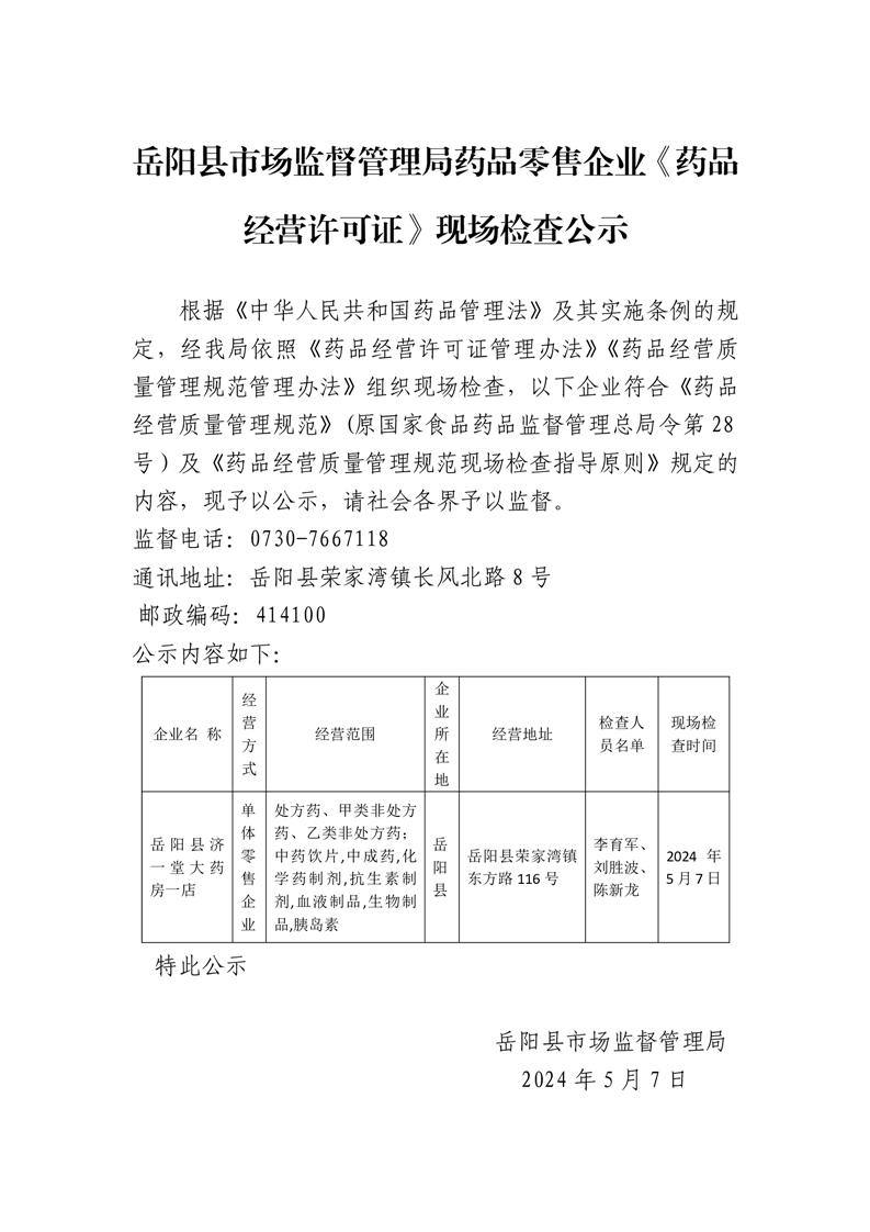 岳阳县市场监督管理局药品零售企业《药品经营许可证》现场检查公示(2024年5月7日)