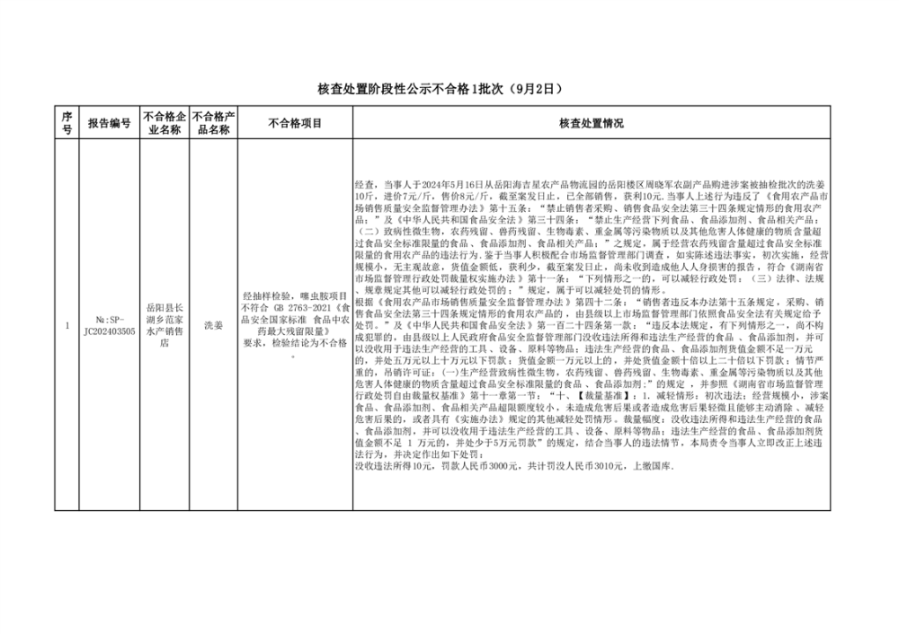 核查处置阶段性公示不合格1批次(9月2日)