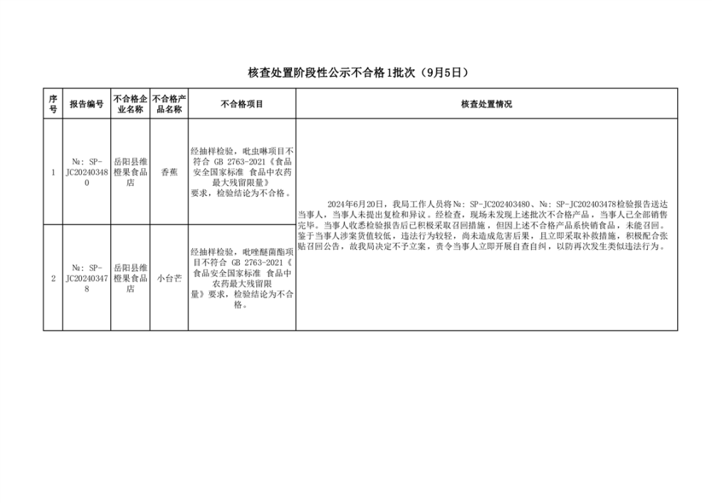 核查处置阶段性公示不合格2批次(9月5日)