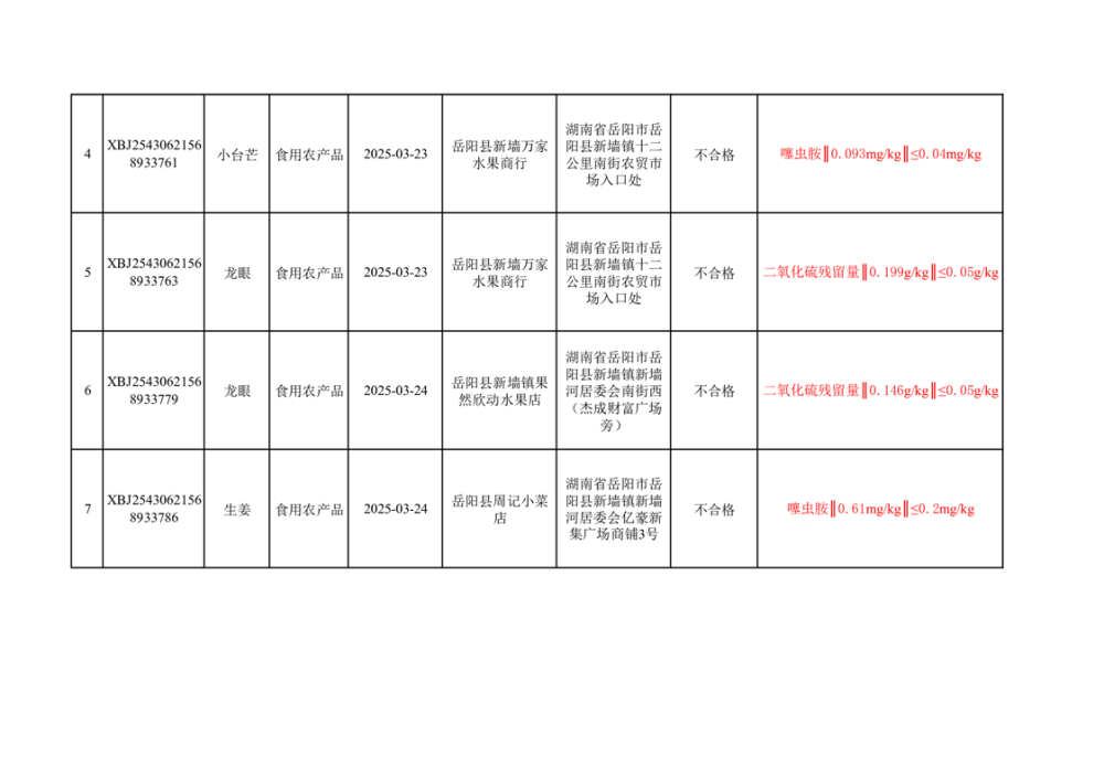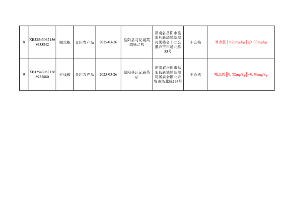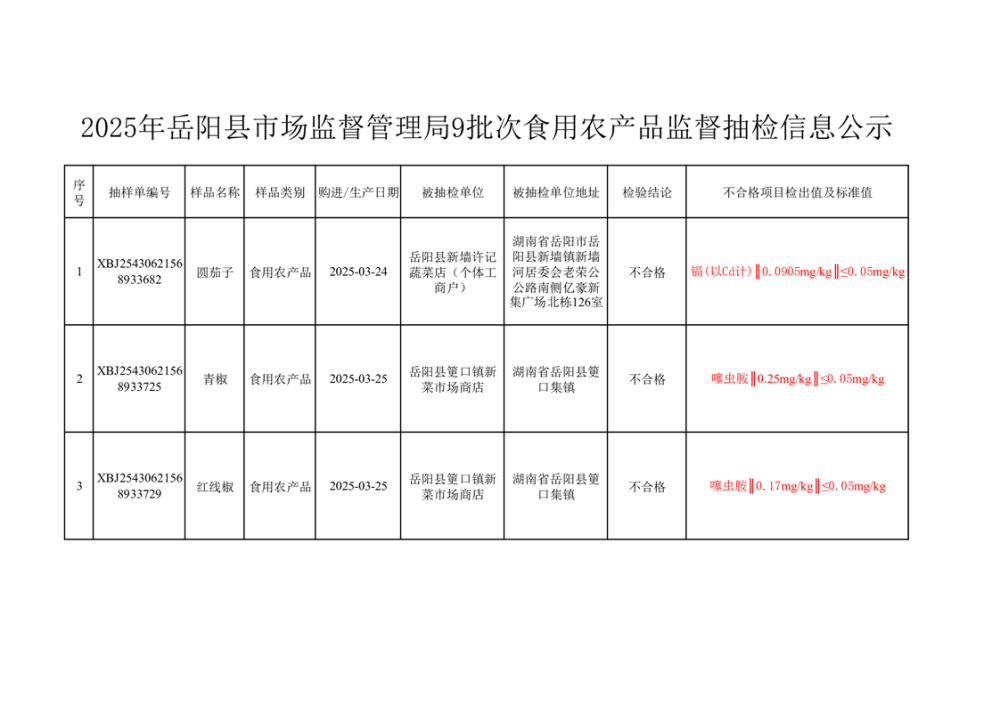 2025年岳阳县市场监督管理局9批次食用农产品监督抽检不合格信息公示(2025年5月12日)