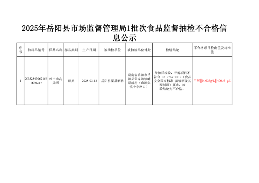 2025年5月27日抽检数据公示(不合格1批次)