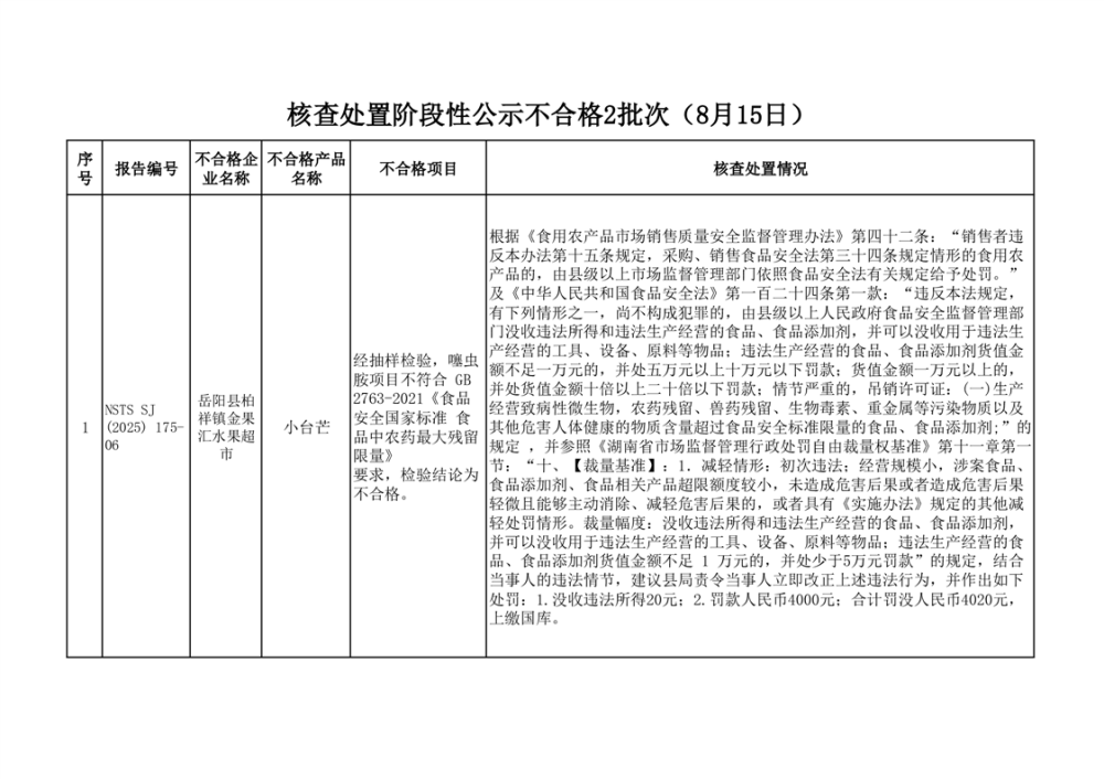 核查处置阶段性信息公示不合格2批次(2025年8月15日)