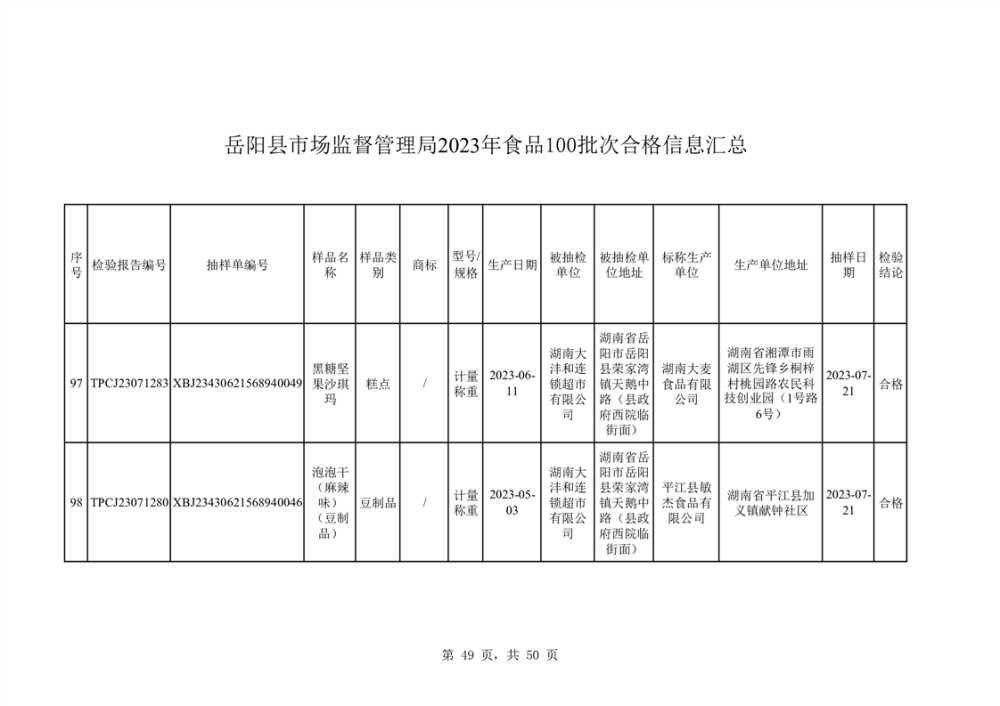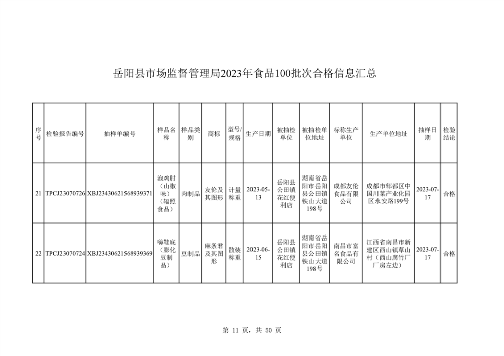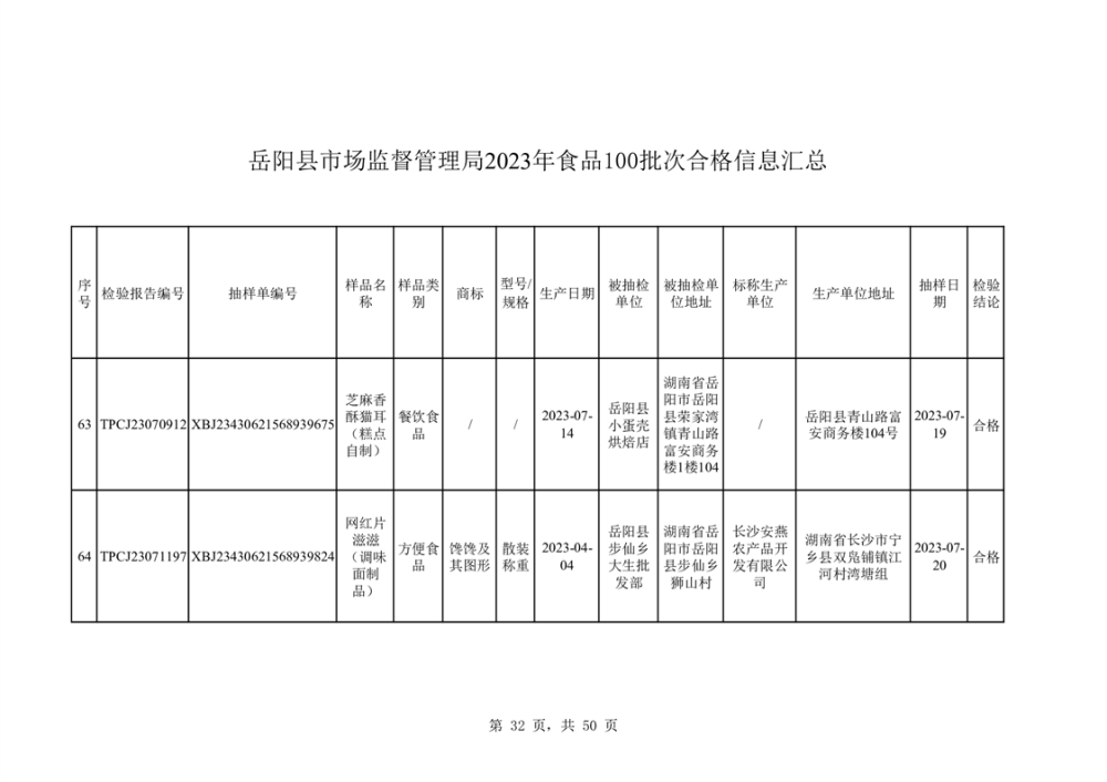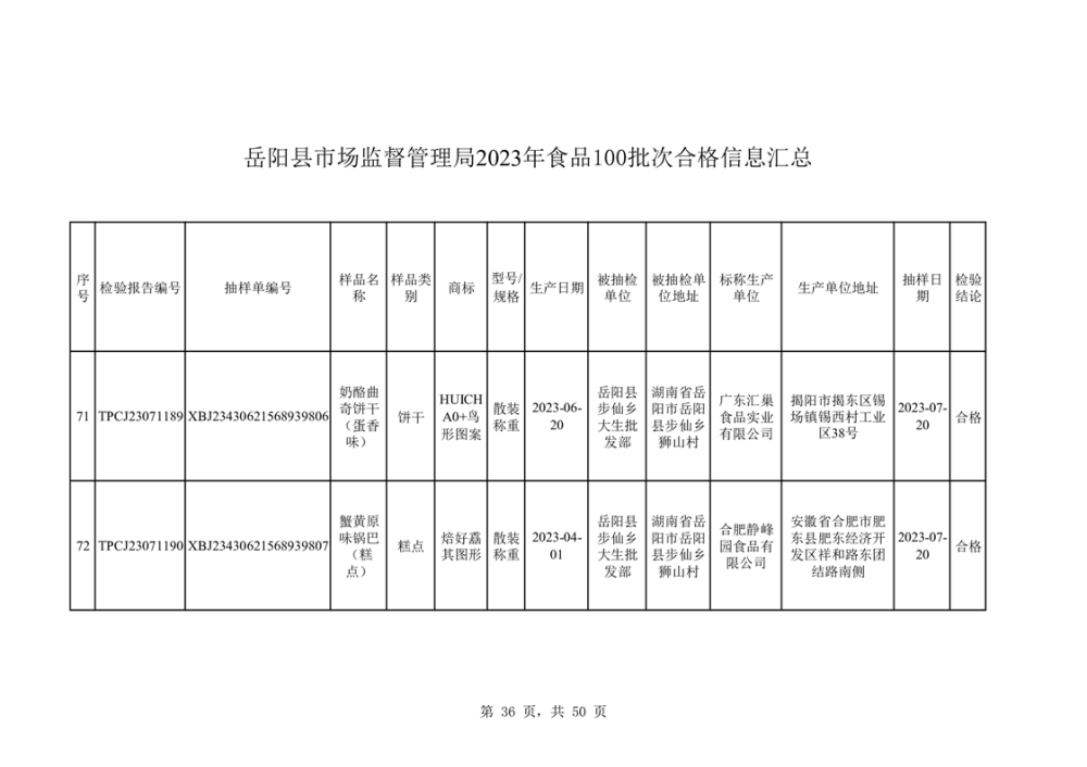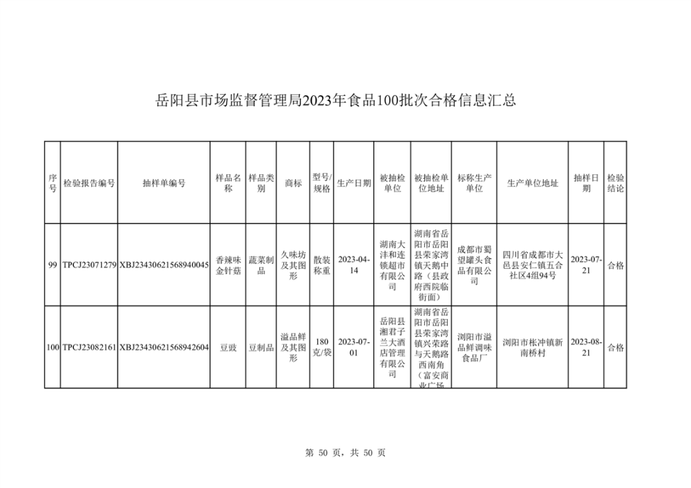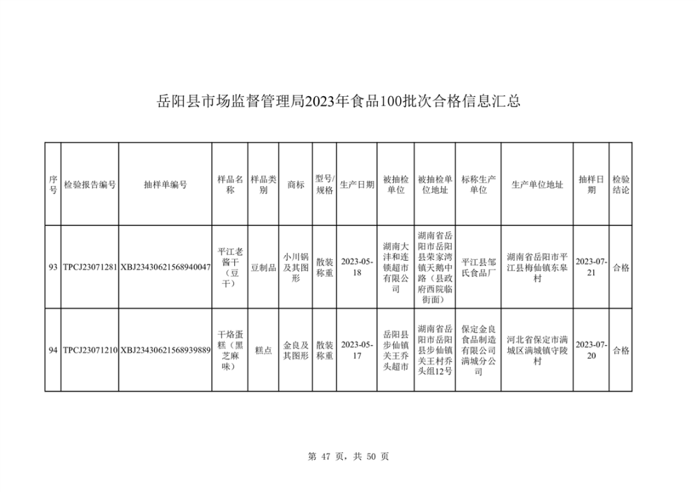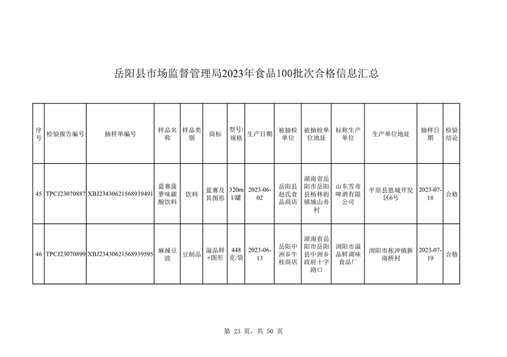 2023年岳阳县市场监督管理局食品合格信息汇总(100批次)