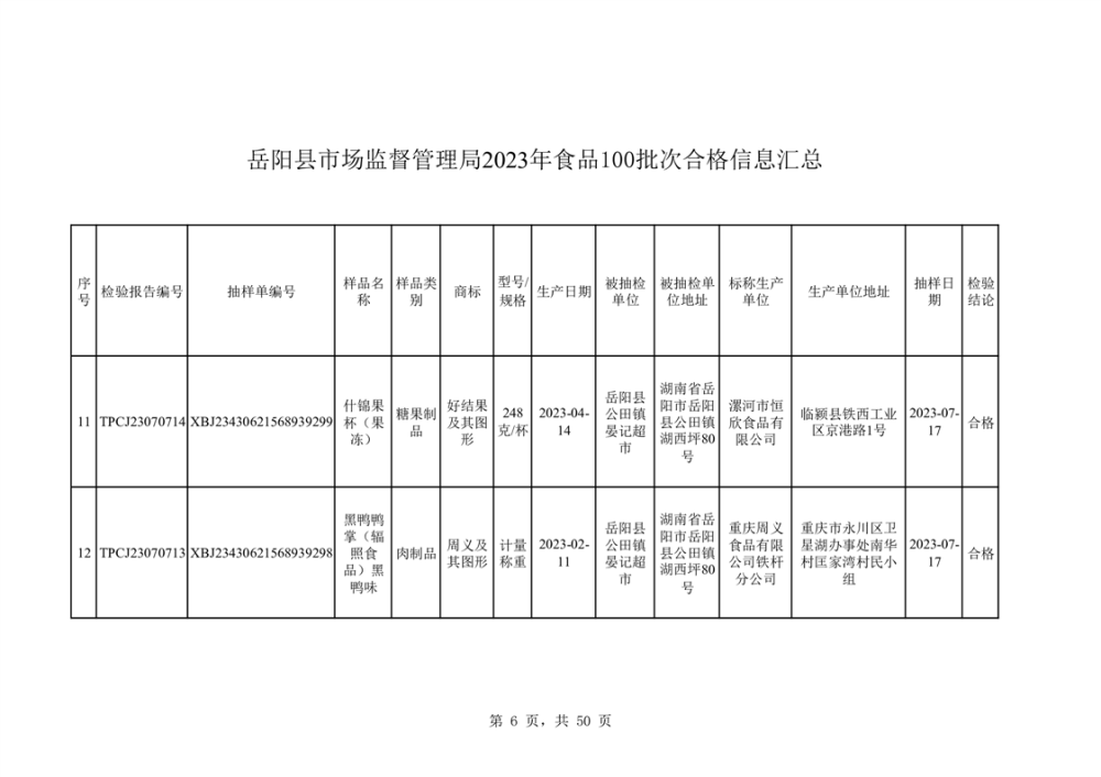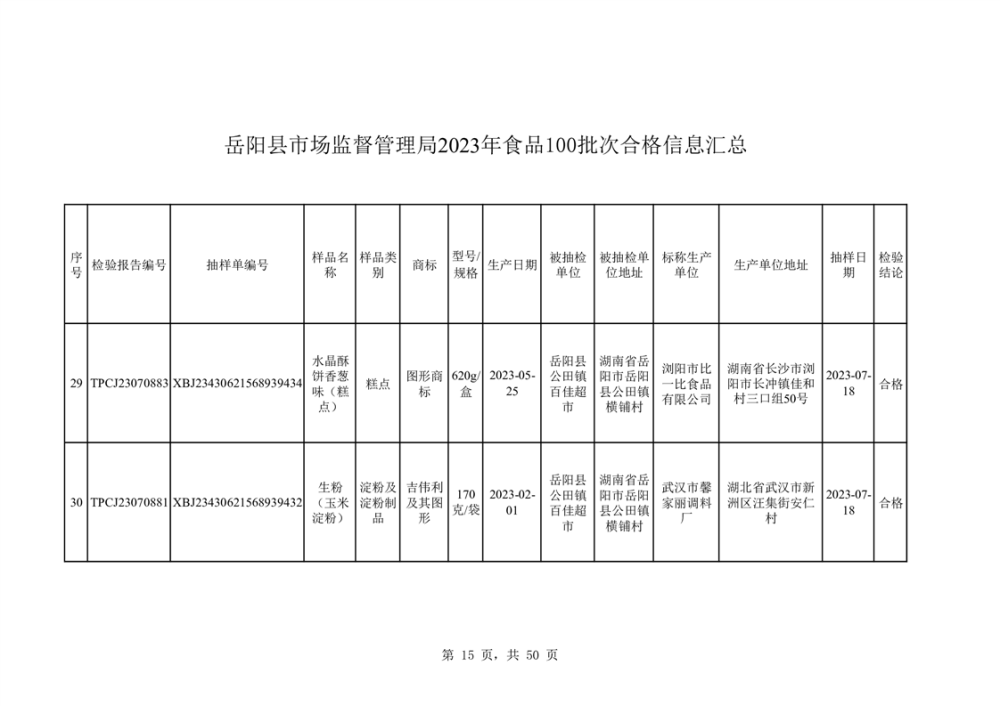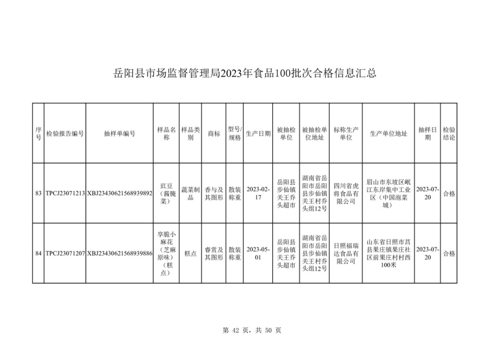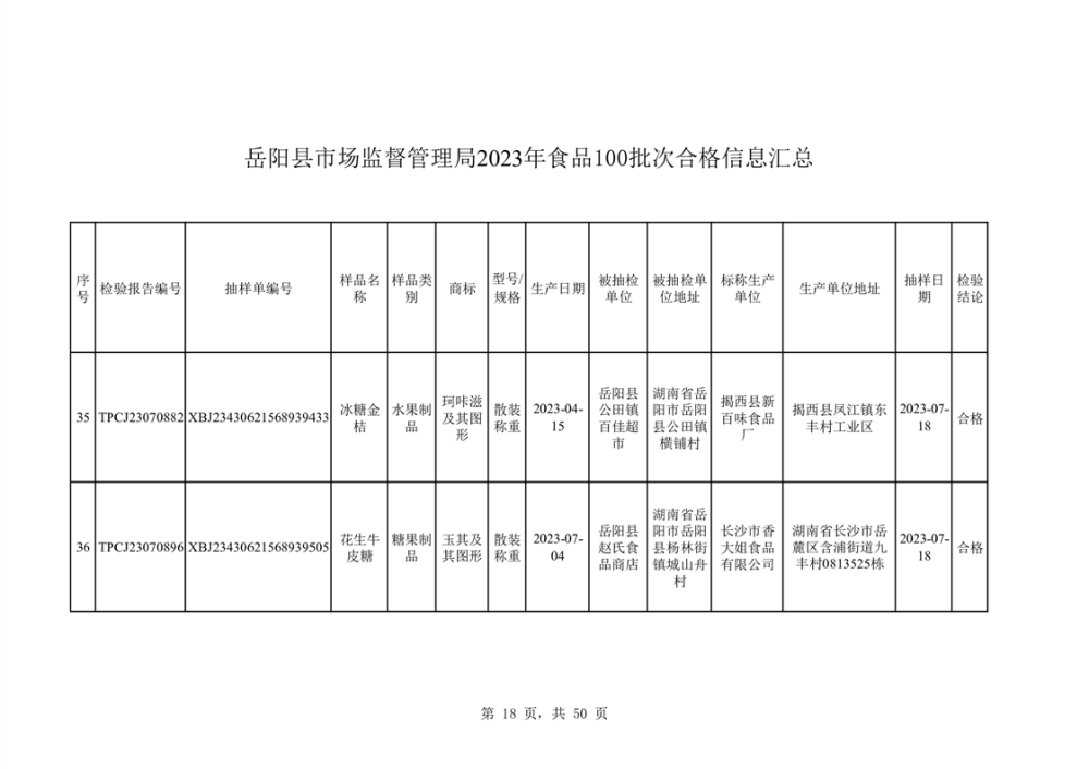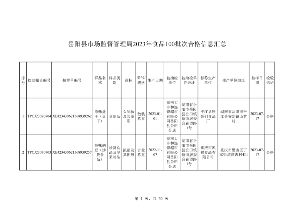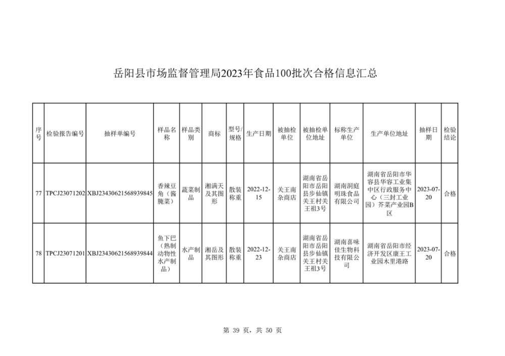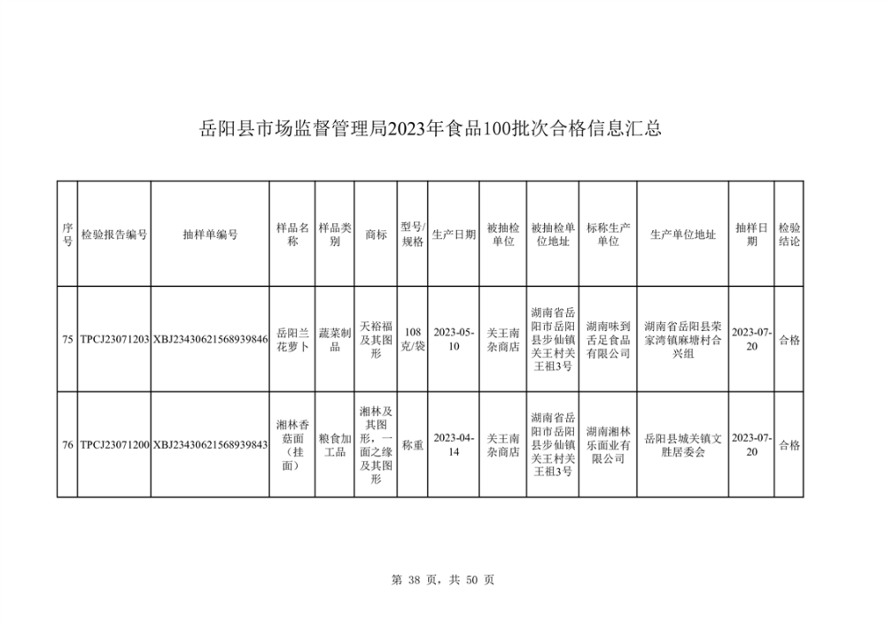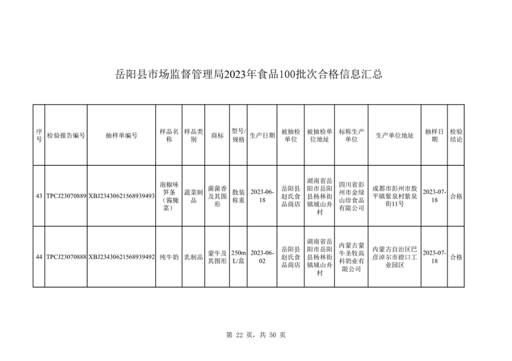 2023年岳阳县市场监督管理局食品合格信息汇总(100批次)