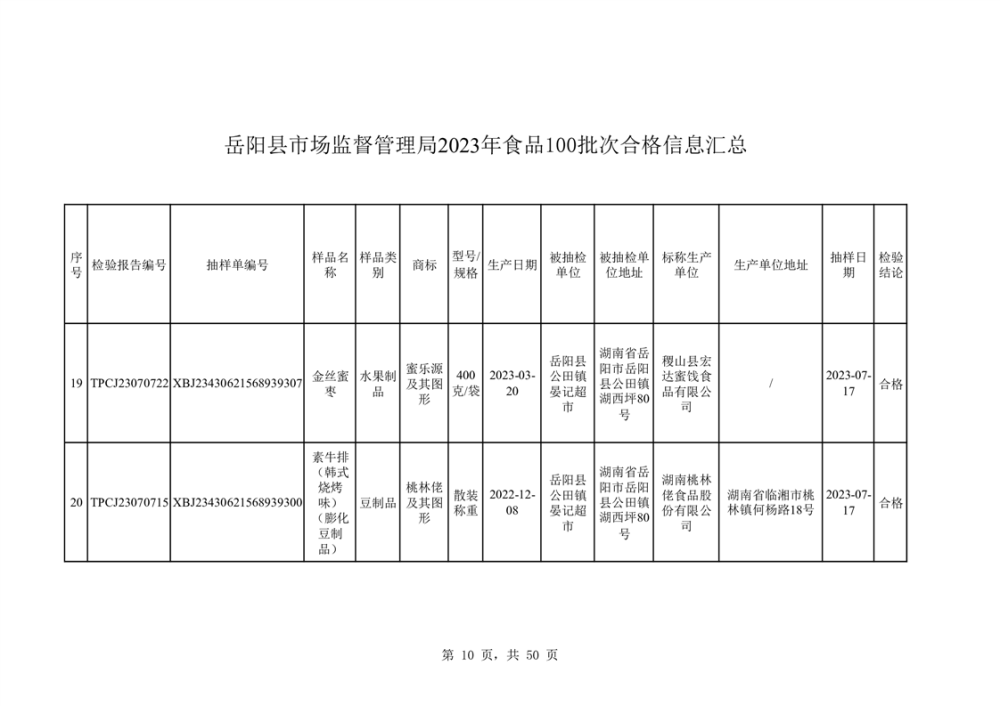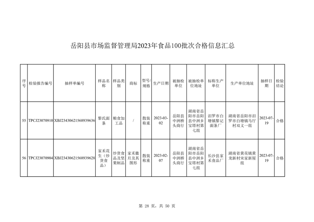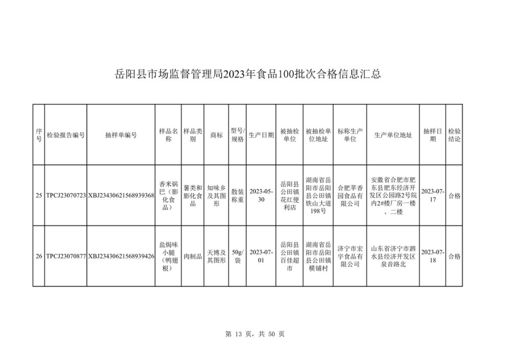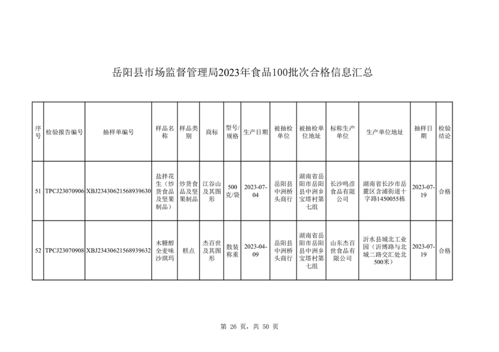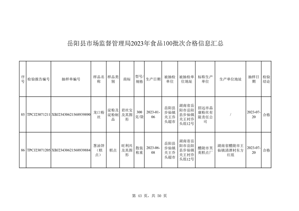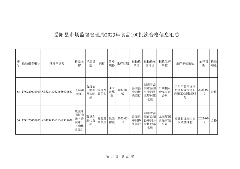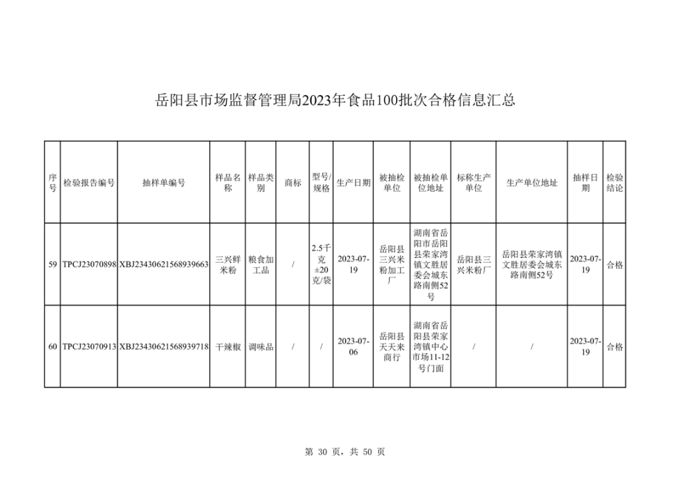 2023年岳阳县市场监督管理局食品合格信息汇总(100批次)