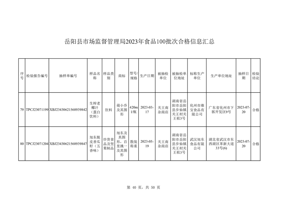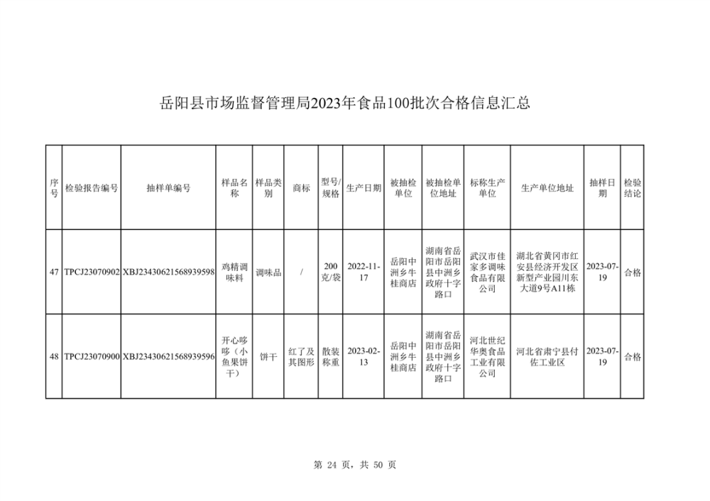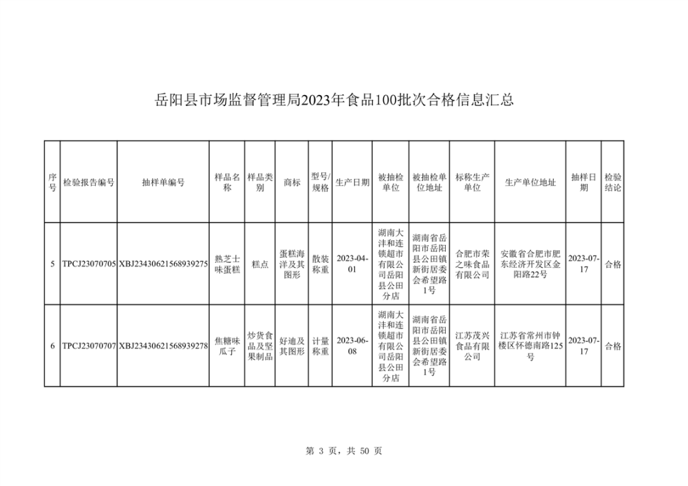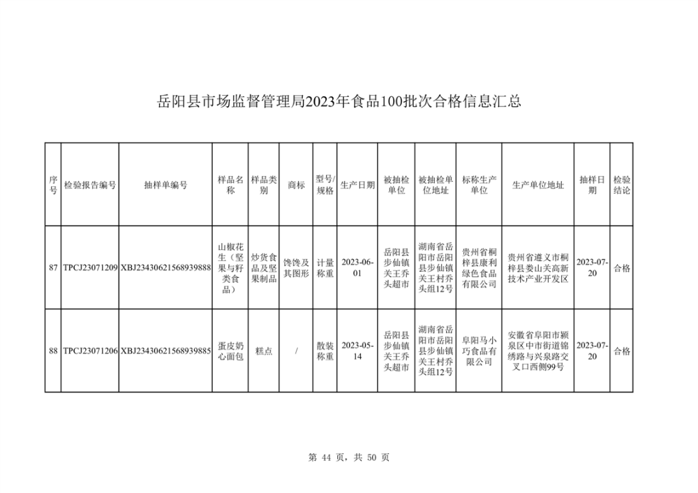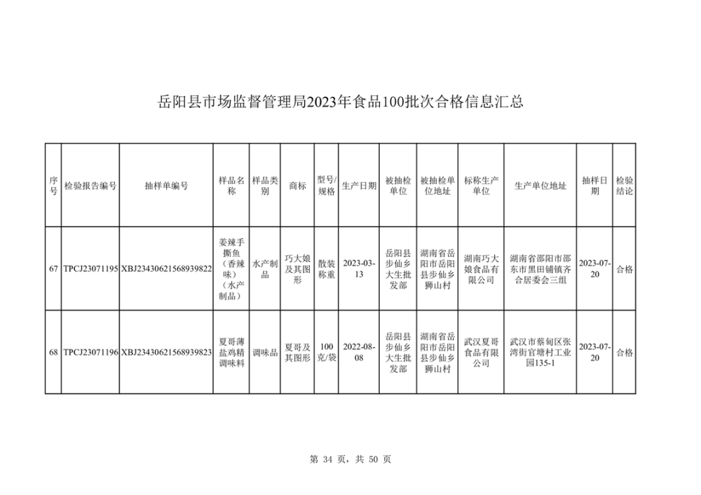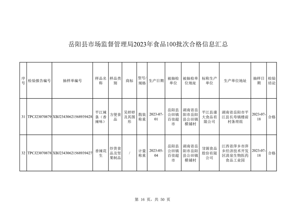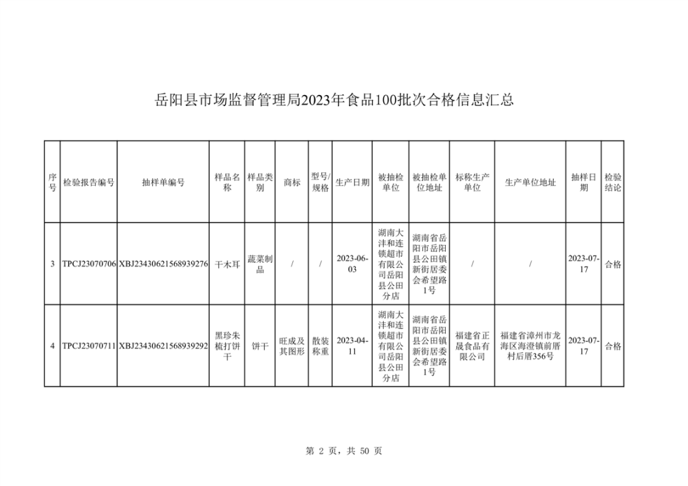 2023年岳阳县市场监督管理局食品合格信息汇总(100批次)