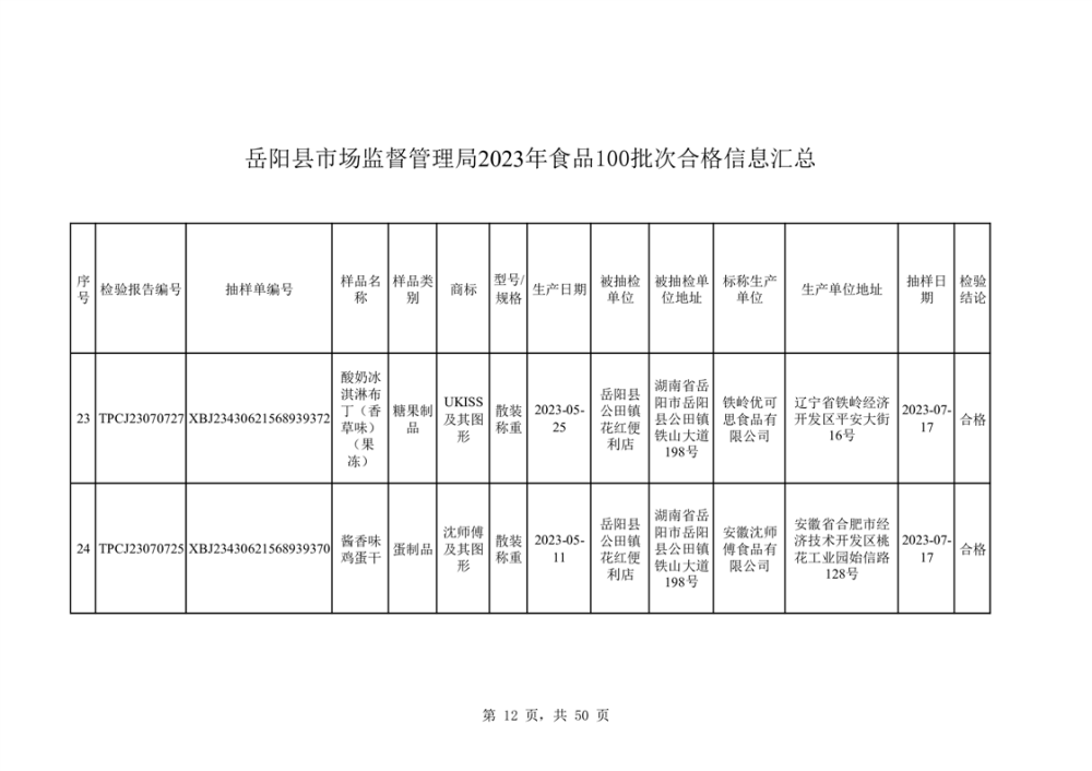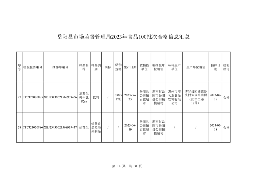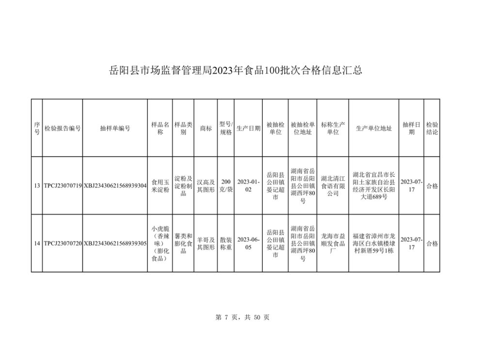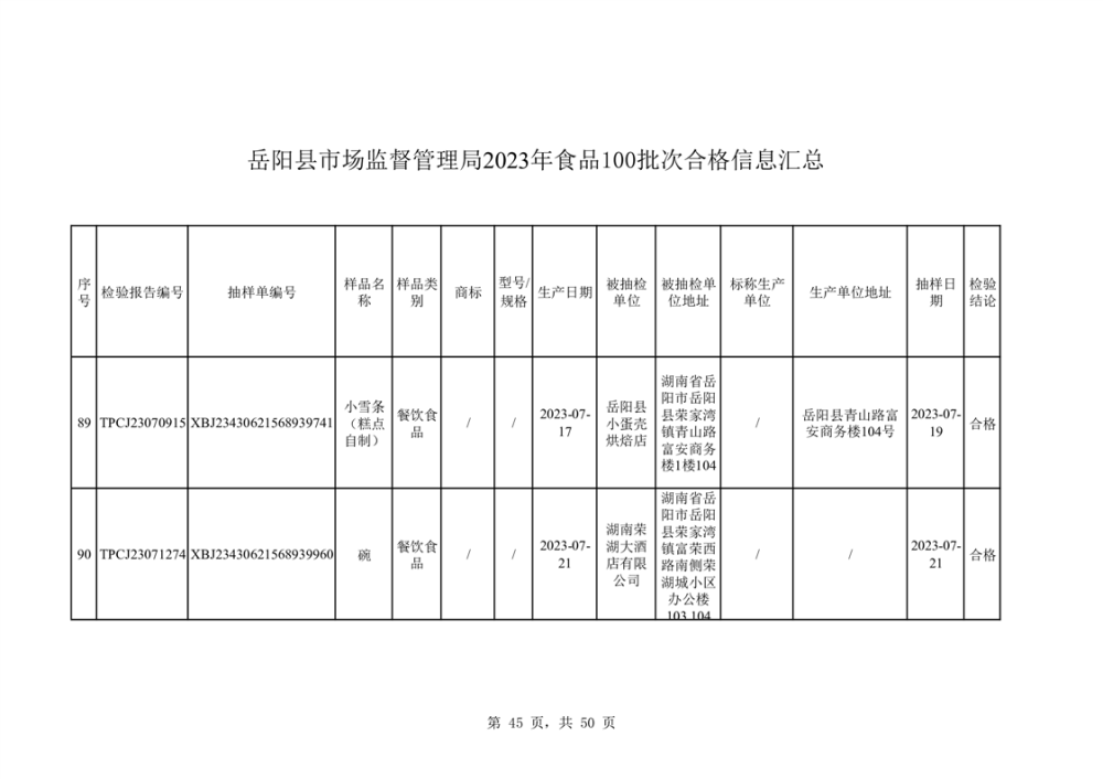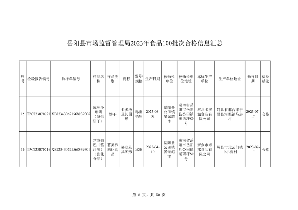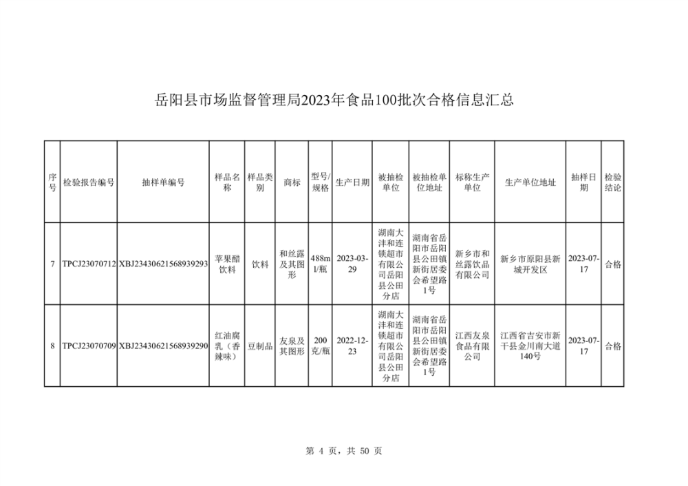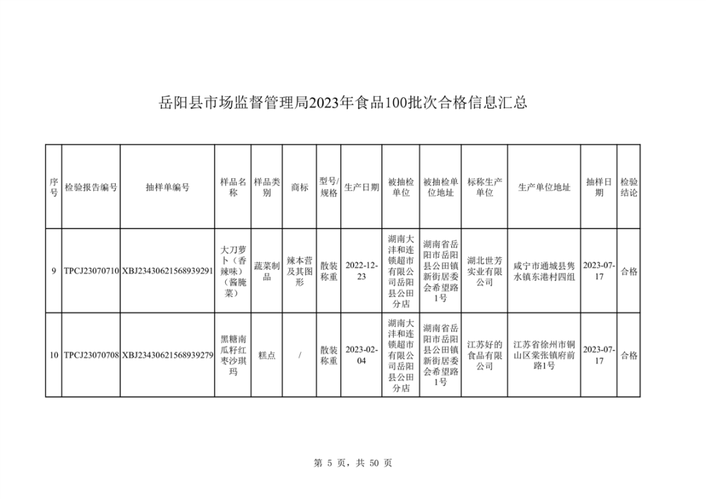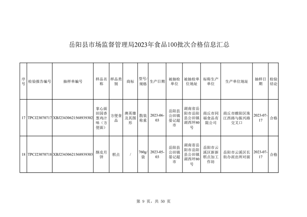 2023年岳阳县市场监督管理局食品合格信息汇总(100批次)