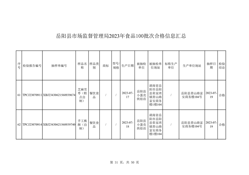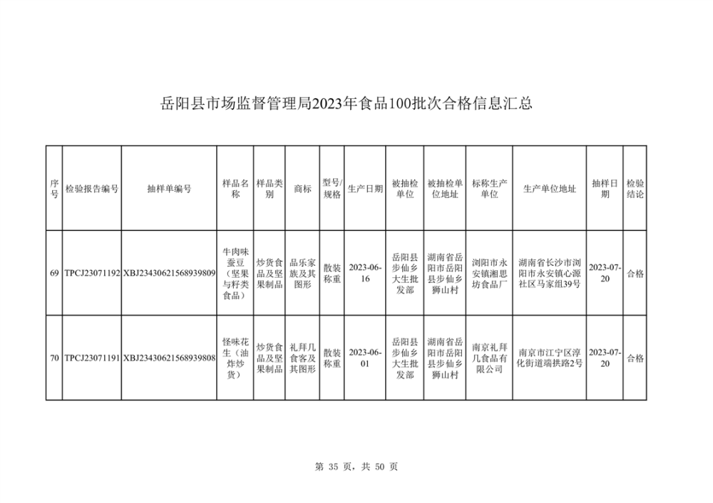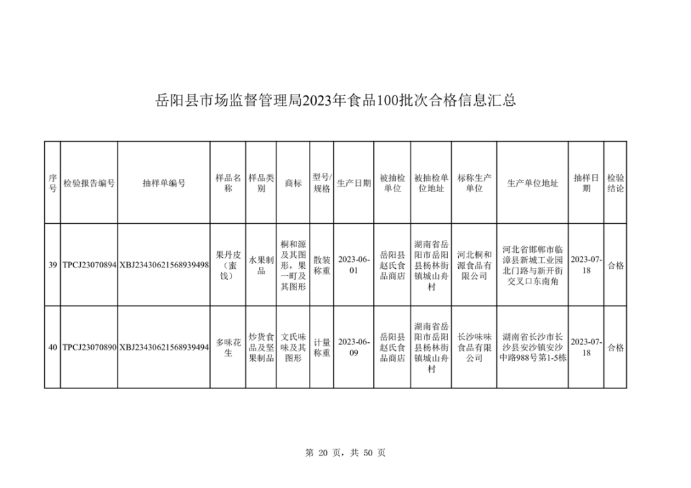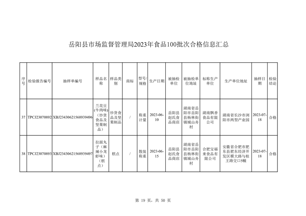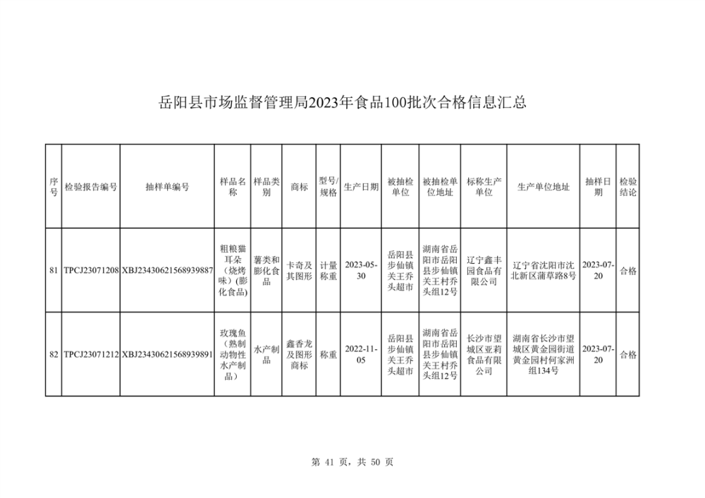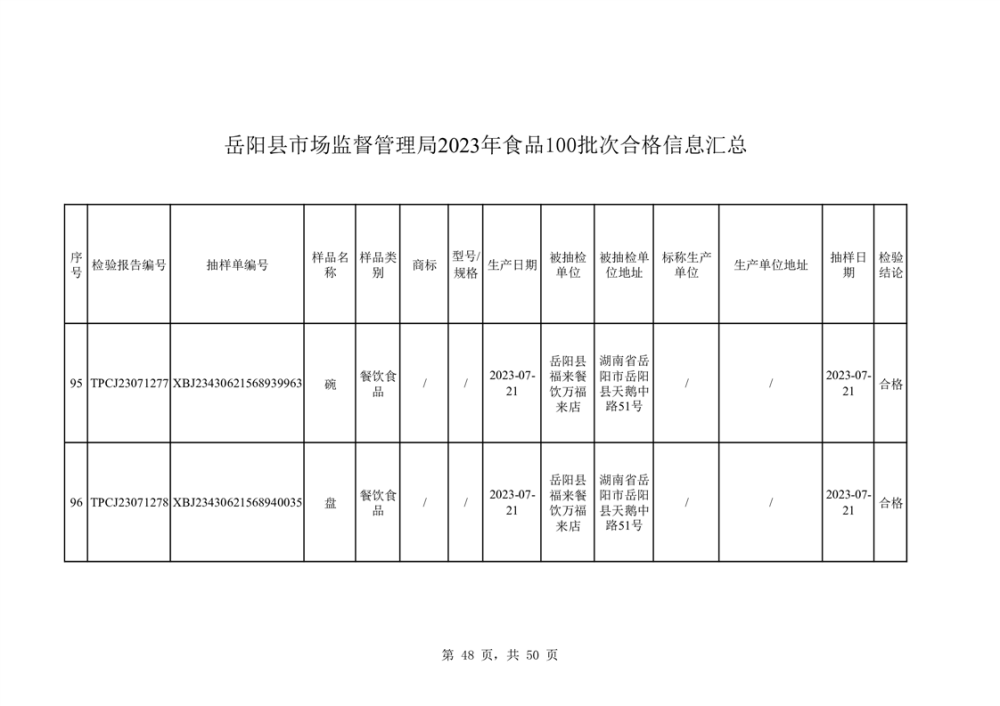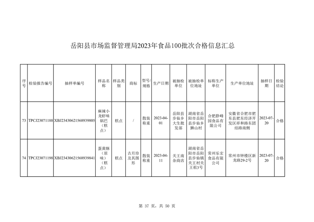 2023年岳阳县市场监督管理局食品合格信息汇总(100批次)