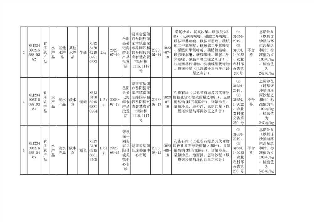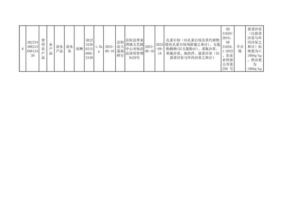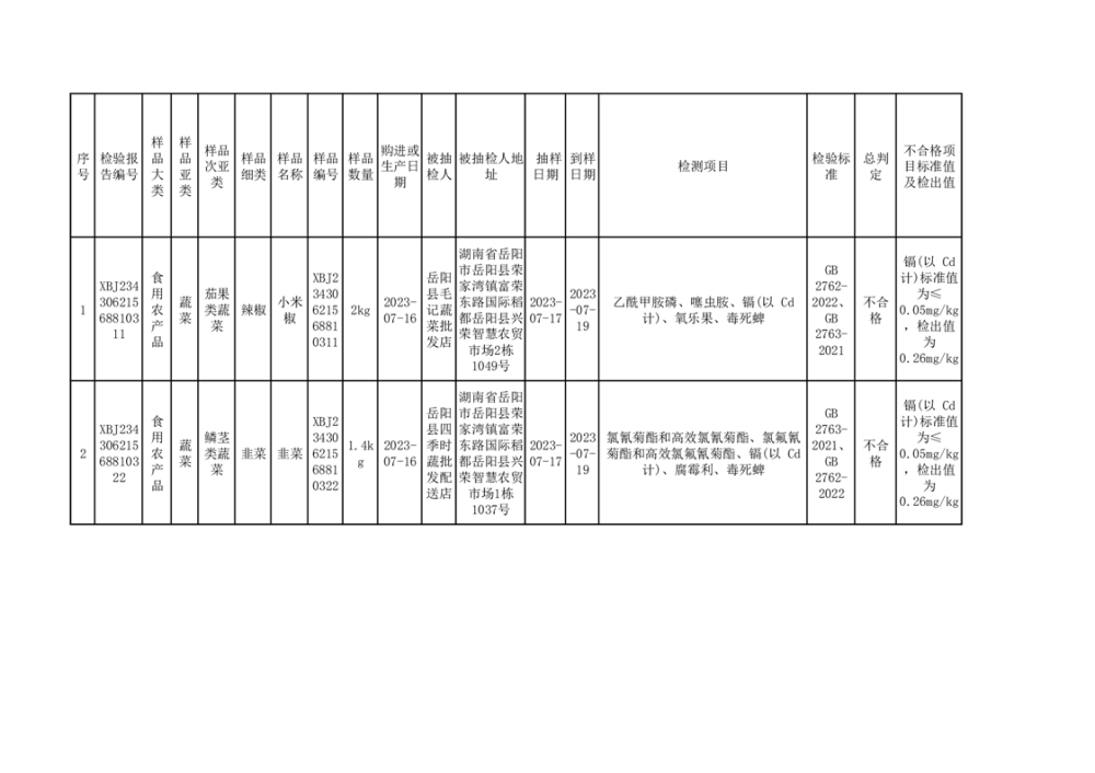 岳阳县农产品抽检情况(不合格6批次)