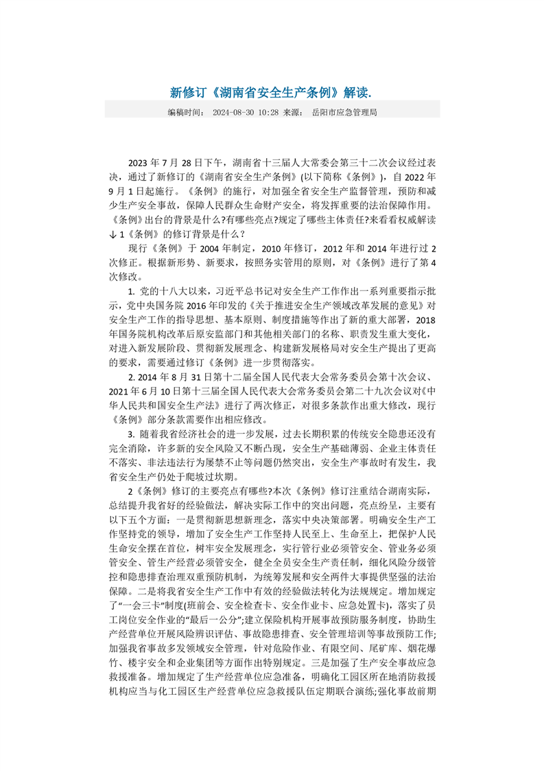 新修订《湖南省安全生产条例》解读
