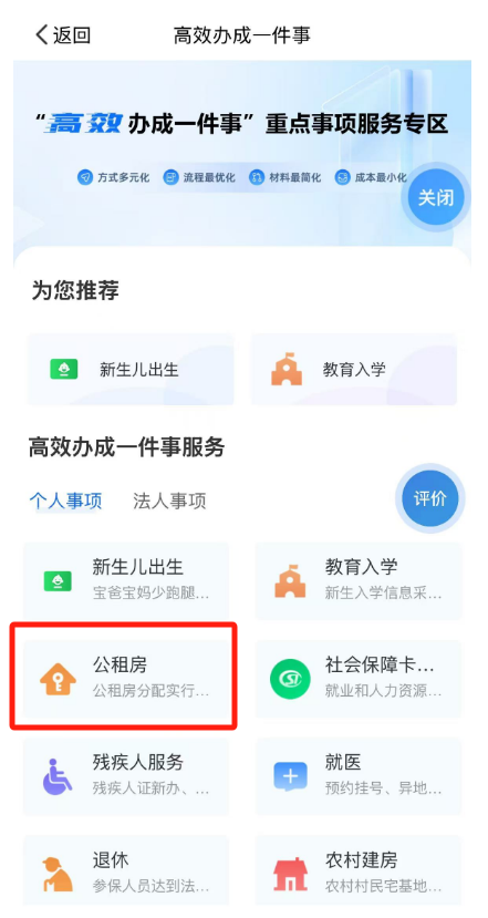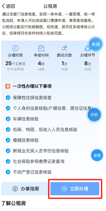5)【公租房】专区可看申请公租房"一件事"相关内容,点击【立即办理】