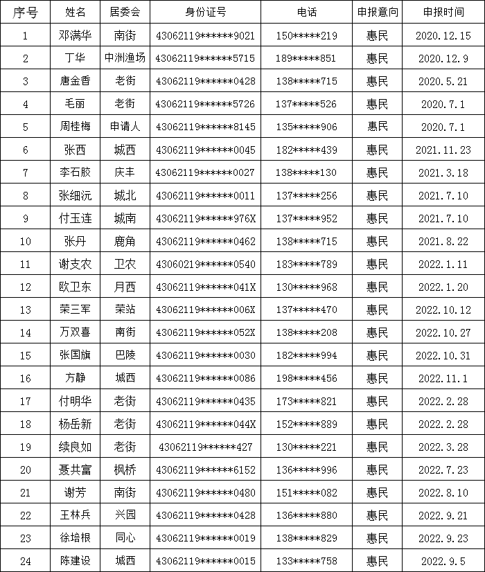 以下人员申报惠民廉租房经各居委会初审合格后,报送县住保中心。县住保中心联合不动产、社保、民政,公安等单位复审合格,拟在2022年11月18号摇号分配,现将名单予以公示。欢迎社会各界予以监督,如发现公示内容与事实不符或有异议,请在公示期内书面或来电反映,逾期不予受理。 特此公示。 联系电话:0730-7662018