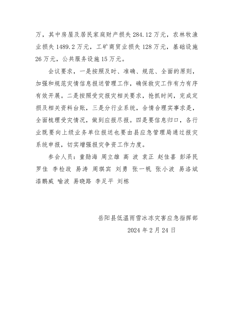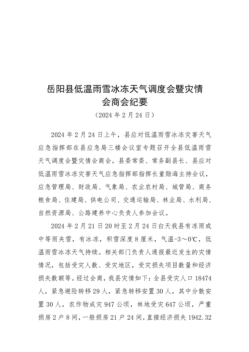 岳阳县低温雨雪冰冻天气调度会暨灾情 会商会纪要