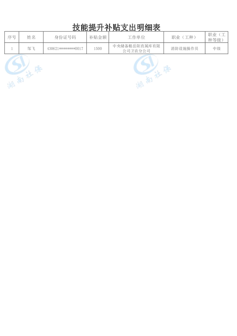 岳阳县2025年3月技能提升补贴支出明细表