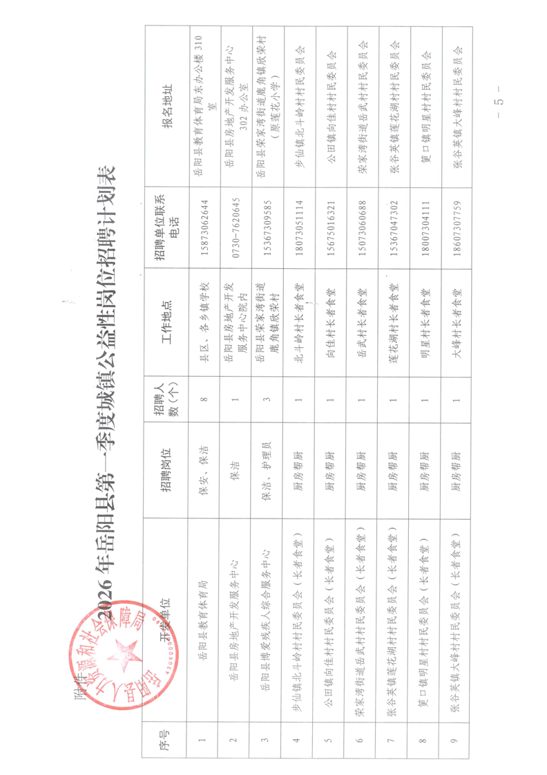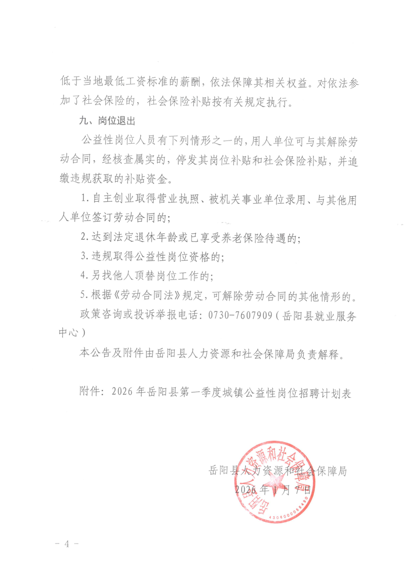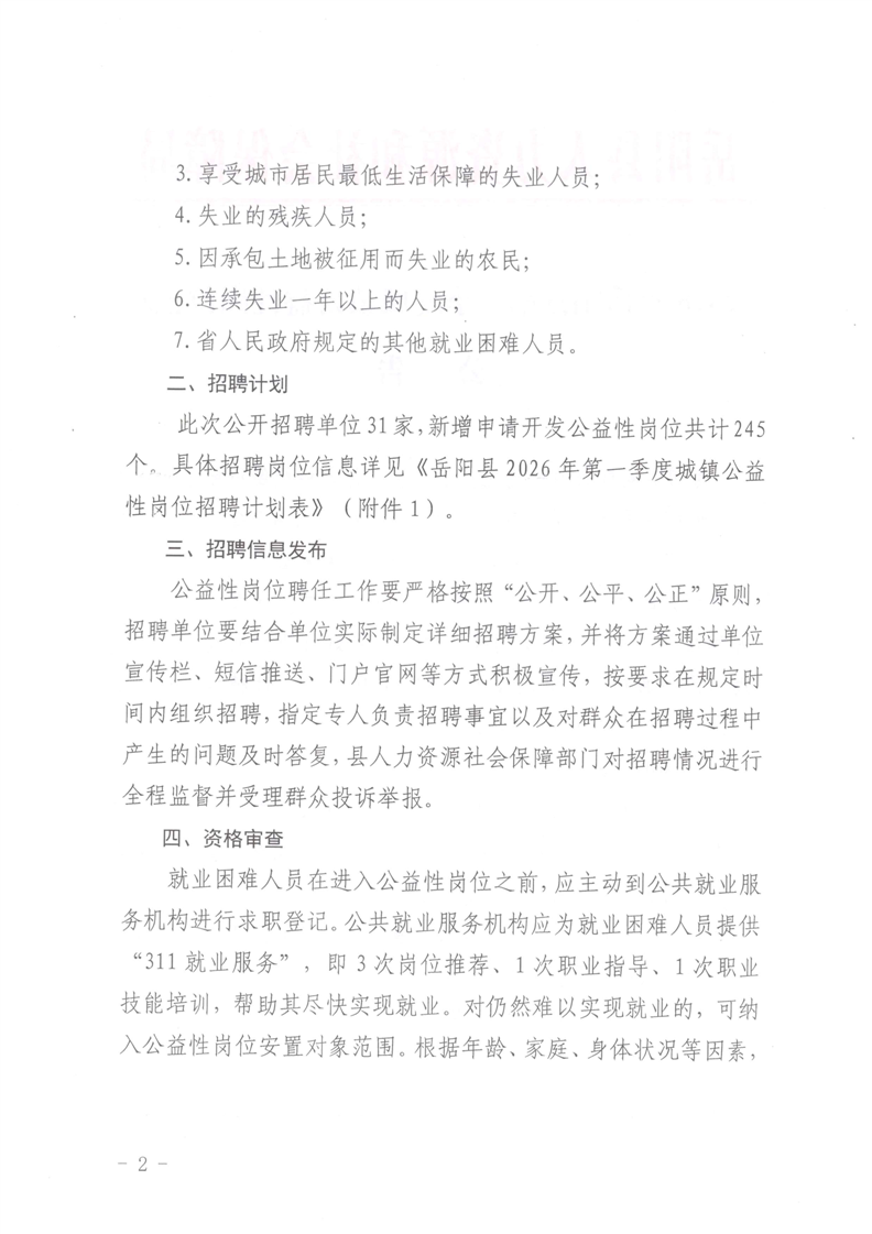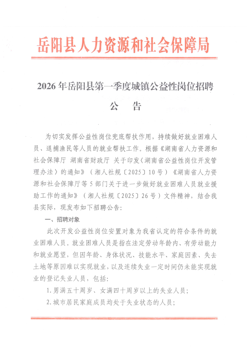 2026年岳阳县第一季度城镇公益性岗位招聘公告