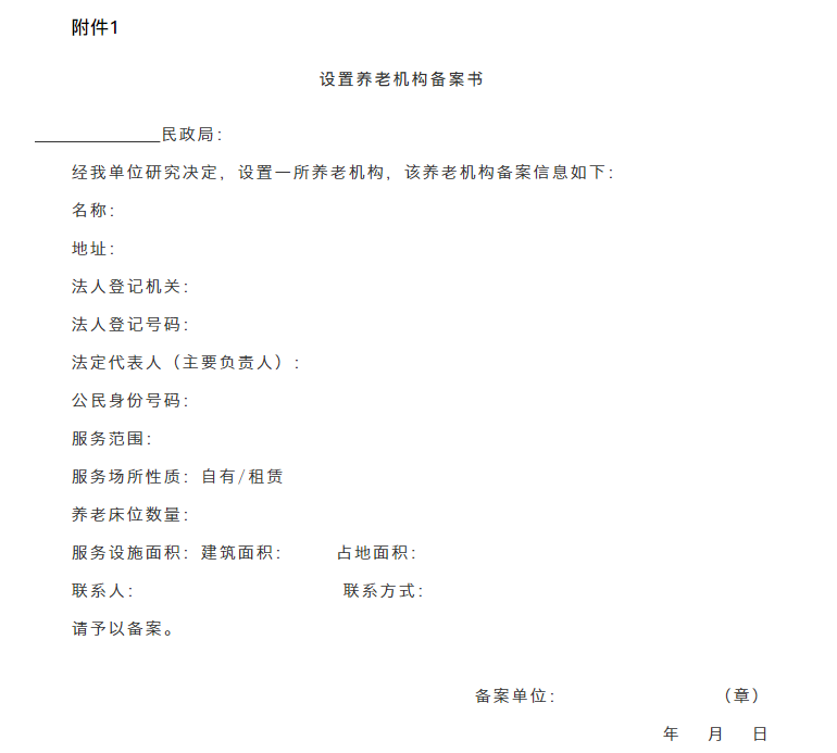 第九条 设立营利性养老机构,应当在市场监督管理部门办理登记。设立非营利性养老机构,应当依法办理相应的登记。 养老机构登记后即可开展服务活动。 第十条 营利性养老机构办理备案,应当在收住老年人后10个工作日以内向服务场所所在地的县级人民政府民政部门提出。非营利性养老机构办理备案,应当在收住老年人后10个工作日以内向登记管理机关同级的人民政府民政部门提出。 第十一条 养老机构办理备案,应当向民政部门提交备案申请书、养老机构登记证书、符合本办法第四条要求的承诺书等材料,并对真实性负责。 备案申请书应当包括下列内容: (一)养老机构基本情况,包括名称、住所、法定代表人或者主要负责人信息等; (二)服务场所权属; (三)养老床位数量; (四)服务设施面积; (五)联系人和联系方式。 民政部门应当加强信息化建设,逐步实现网上备案。 第十二条 民政部门收到养老机构备案材料后,对材料齐全的,应当出具备案回执;材料不齐全的,应当指导养老机构补正。 第十三条 已经备案的养老机构变更名称、法定代表人或者主要负责人等登记事项,或者变更服务场所权属、养老床位数量、服务设施面积等事项的,应当及时向原备案民政部门办理变更备案。 养老机构在原备案机关辖区内变更服务场所的,应当及时向原备案民政部门办理变更备案。营利性养老机构跨原备案机关辖区变更服务场所的,应当及时向变更后的服务场所所在地县级人民政府民政部门办理备案。 第十四条 民政部门应当通过政府网站、政务新媒体、办事大厅公示栏、服务窗口等途径向社会公开备案事项及流程、材料清单等信息。 民政部门应当依托全国一体化在线政务服务平台,推进登记管理机关、备案机关信息系统互联互通、数据共享。