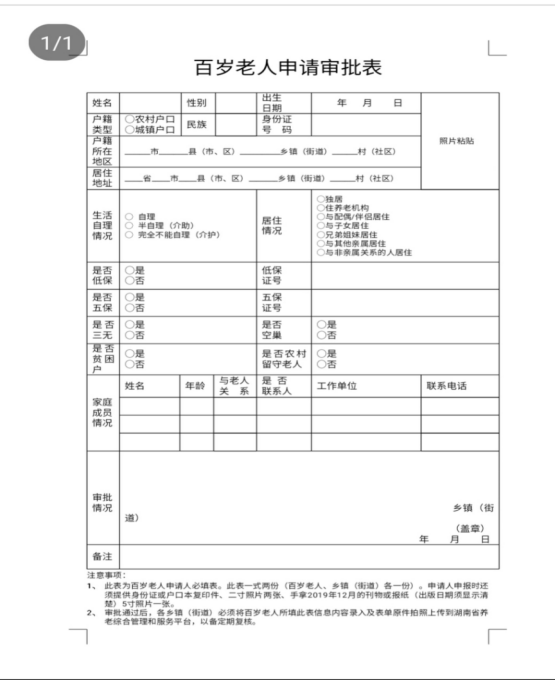 一、事项名称 :百岁老人长寿保健补贴发放 二、服务对象:自然人 三、受理条件:本县户籍,年满100周岁的老年人给于600元每人每月长寿保健金发放 四、办理证照(事项/服务) 五、受理方式 1.就近办:各乡镇、社区便民服务中心 六、审批决定机构 岳阳县民政局 七、材料清单