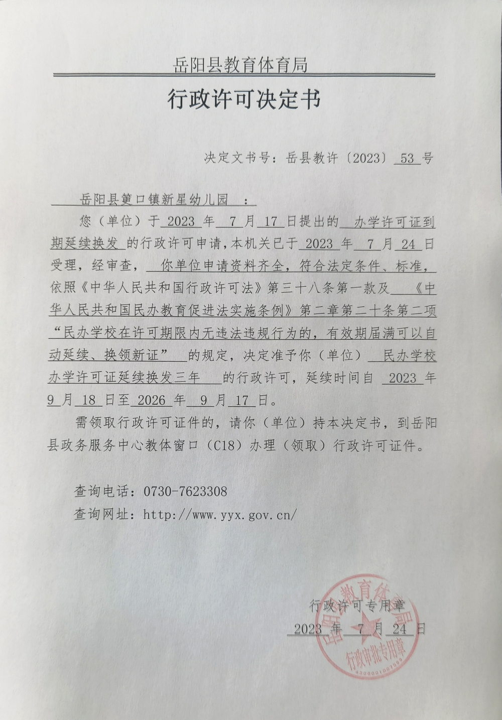 关于准予岳阳县筻口镇新星幼儿园办学许可证到期延续换发的许可决定